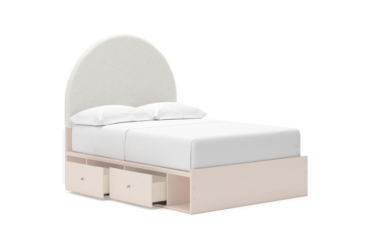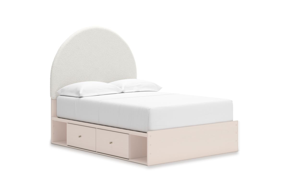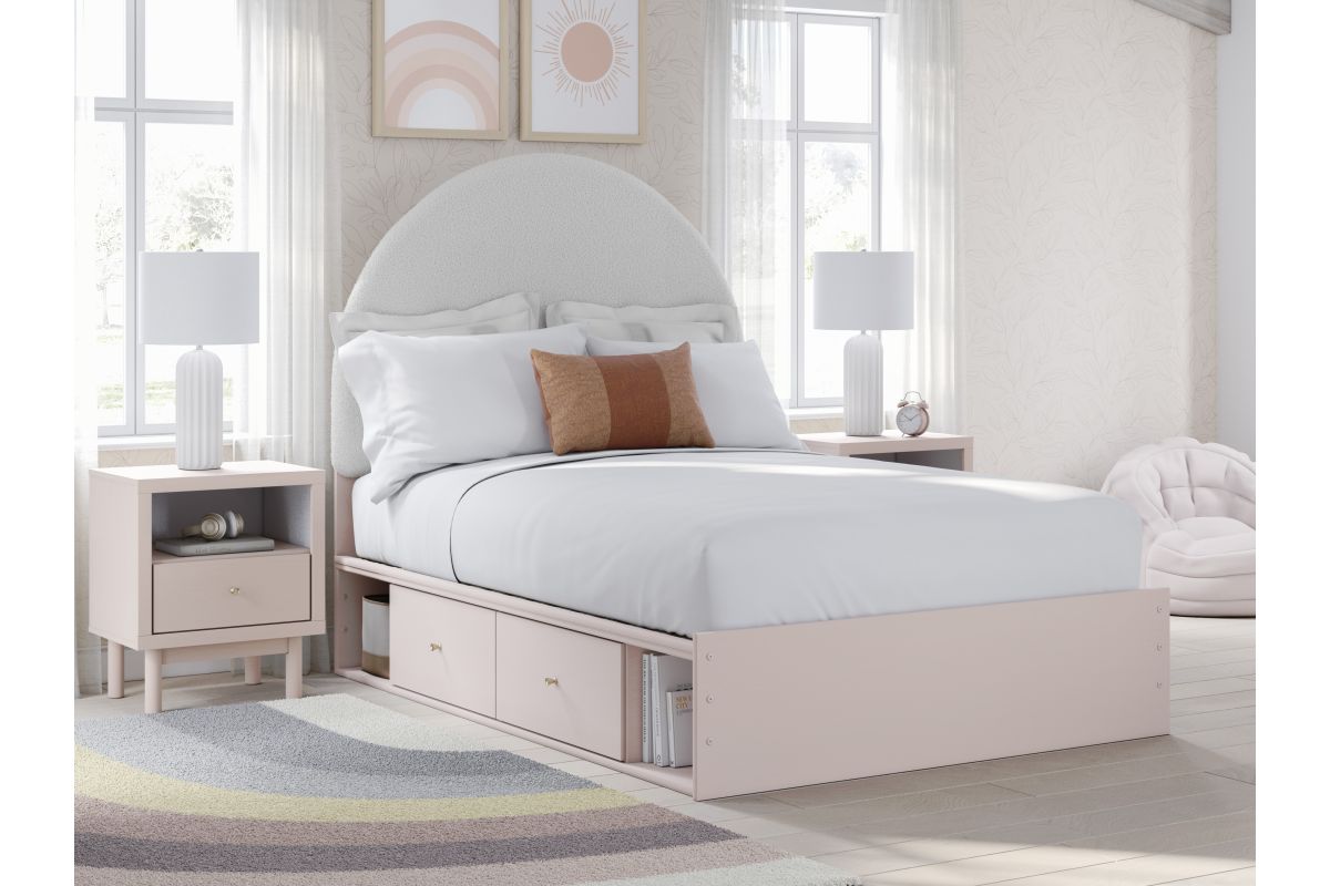 Pretty in pink. This full upholstered panel bed with storage keeps the spirit of your home’s modern aesthetic while suiting all your young one’s needs. Its cozy-cute upholstery and subtle blush finish bring a playful, charming vibe to bedtime. Made for her and styled for you, it’s a lovely addition to a beautifully chic child’s bedroom.
