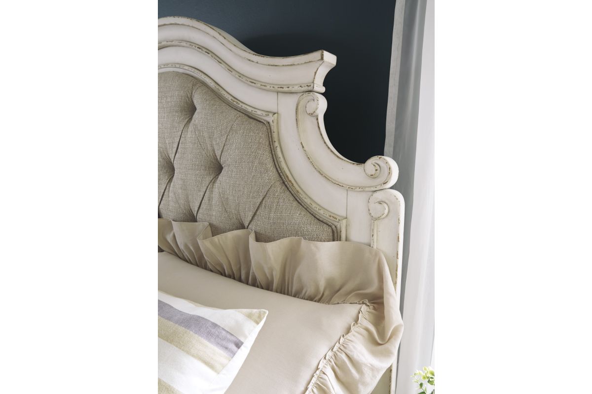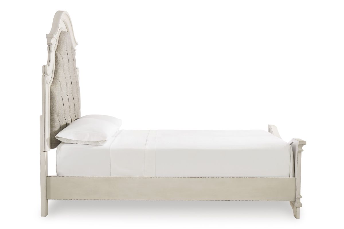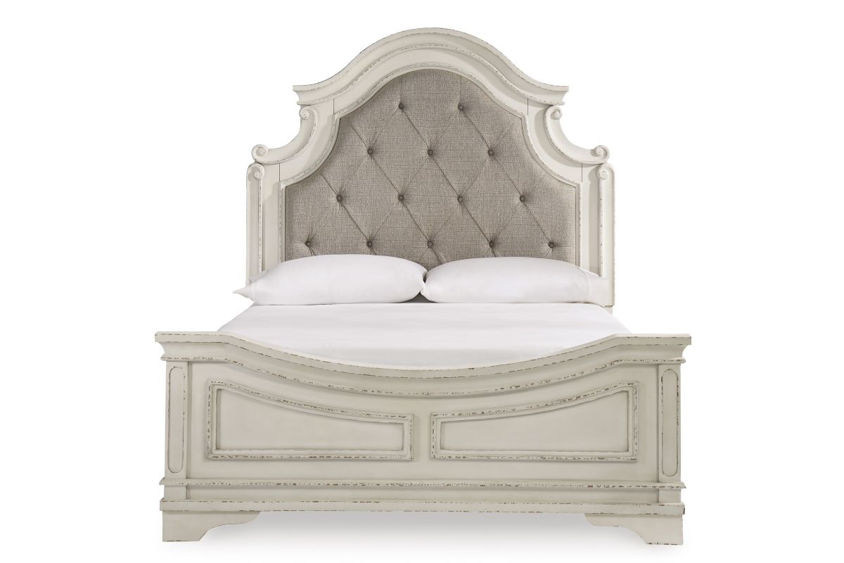Elevating the art of traditional cottage styling, this California king upholstered bed is your dream bedroom retreat realized. A curvaceous beauty, this brilliant upholstered bed wows with dramatic scalloped details and fanciful trim work. The distressed chipped white finish charms with its heirloom appeal. Deep tufting on the cushioned upholstered headboard adds such a cozy element sure to put you at ease. Mattress and foundation/box spring available, sold separately.