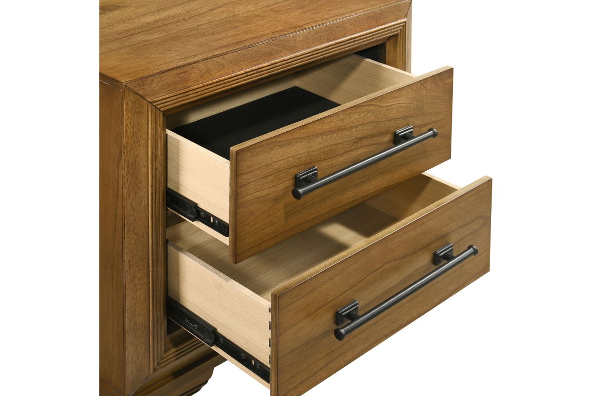 Enhance your bedroom with the Talcott Nightstand in a warm honey finish, expertly crafted from solid rubberwood, manufactured woods, and Mindy wood veneers for strength and stability. This transitional piece combines traditional and contemporary elements, featuring distinctive bracket feet, robust picture frame moldings, and sleek elongated drawer pulls. The hand-rubbed, multi-step finish highlights the wood's natural beauty, while premium dovetail joinery and ball-bearing glides ensure smooth, full-extension drawer operation. With two spacious drawers, including a velvet-lined top drawer for delicate items, this nightstand offers ample storage and a unique, modern flair, making it a stylish and practical addition to any bedroom. Assembly required.