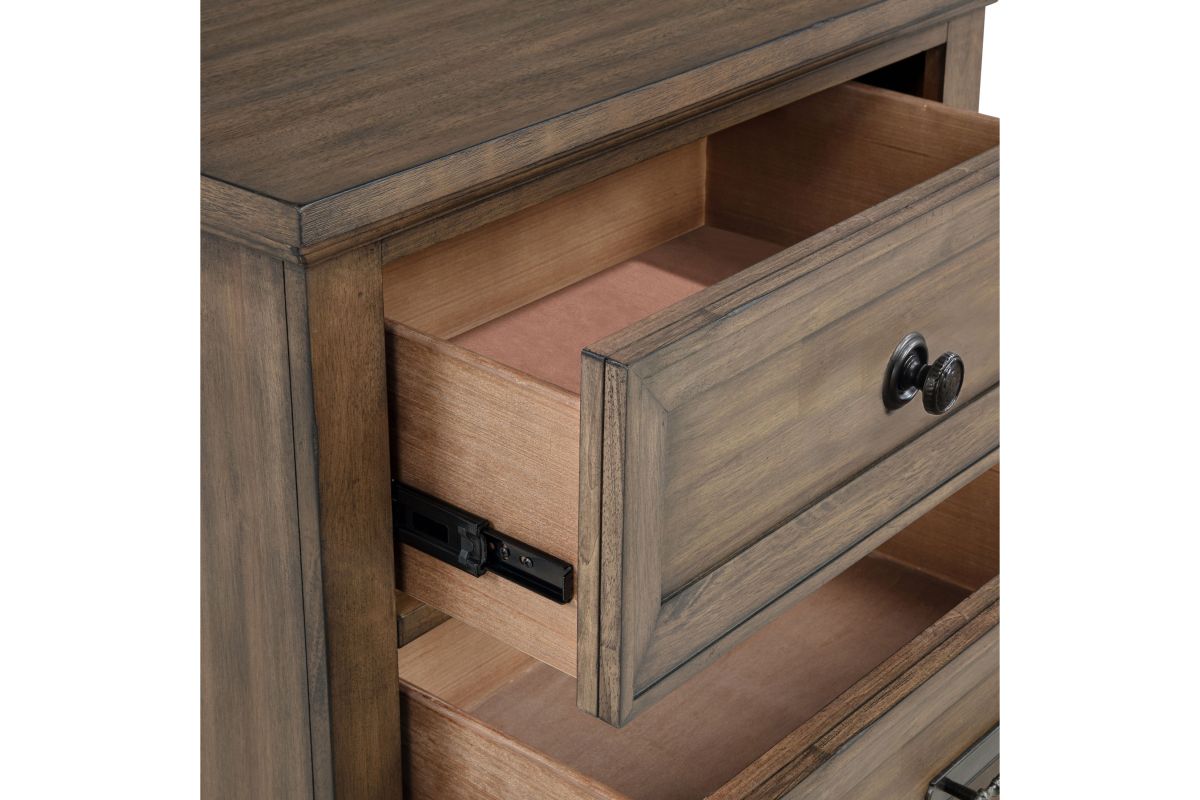 The Mariana 2-Drawer Nightstand is a perfect blend of timeless craftsmanship and functional elegance, making it an ideal addition to any bedroom. Crafted from solid Acacia wood and enhanced with Acacia veneers, this nightstand features a rich, hand-distressed Mocha Brown that exudes an old-world charm. Its design artfully combines traditional elegance, rustic charm, and colonial craftsmanship, creating a warm and inviting ambiance while commanding attention with its sturdy construction. The spacious drawers, crafted with masterful dovetail joinery and lined with luxurious velvet in the top drawer, offer smooth, snag-free storage, gliding effortlessly on precision-engineered, full-extension drawer glides. A discreet USB charging connection on the back adds a modern convenience, ensuring your devices are always powered and within easy reach. Perfectly balancing style and durability, this nightstand serves as a captivating focal point in any classic, cozy, or historically inspired space. Assembly required.