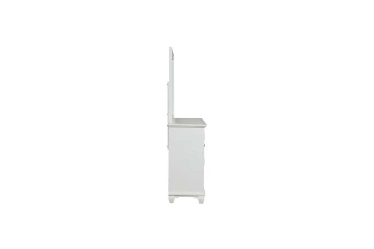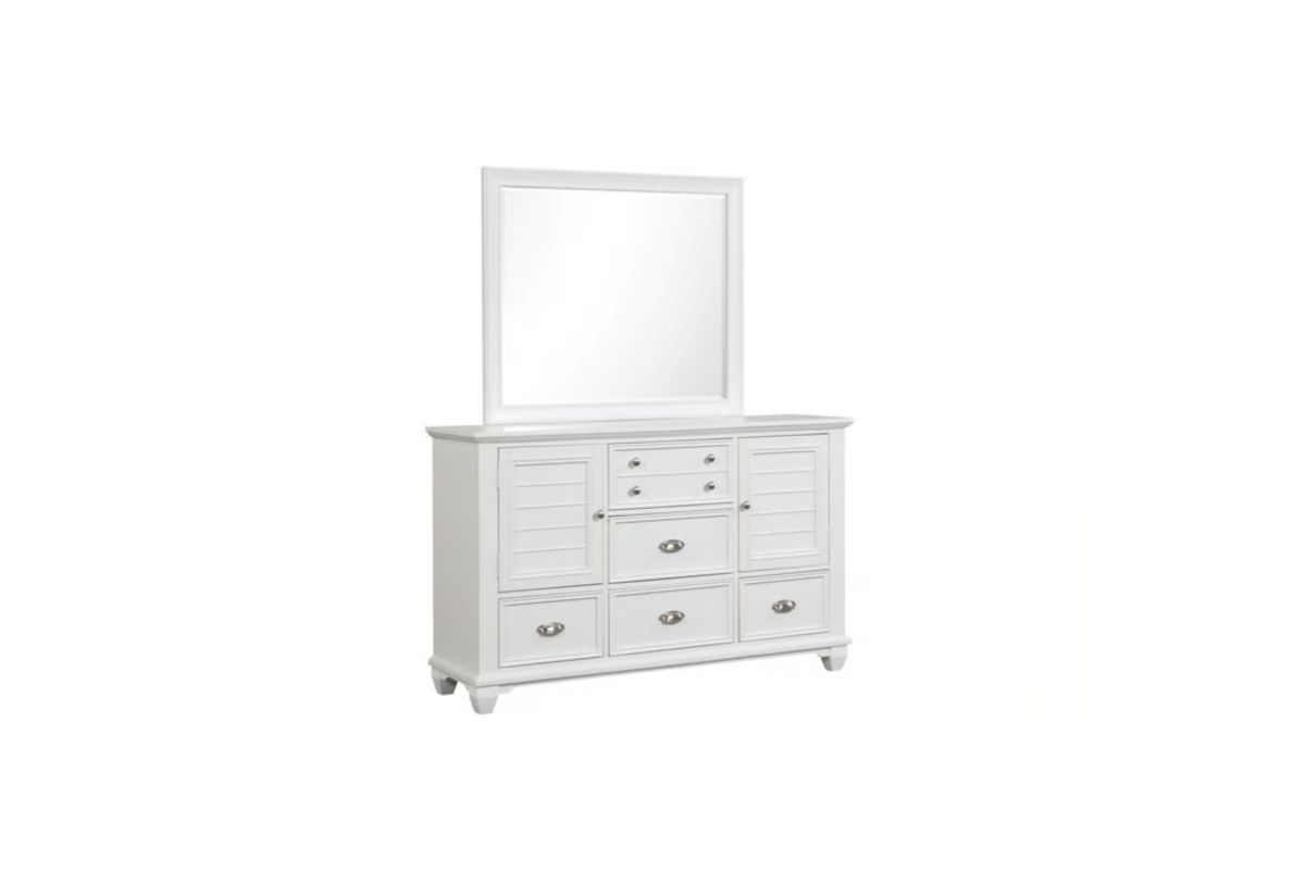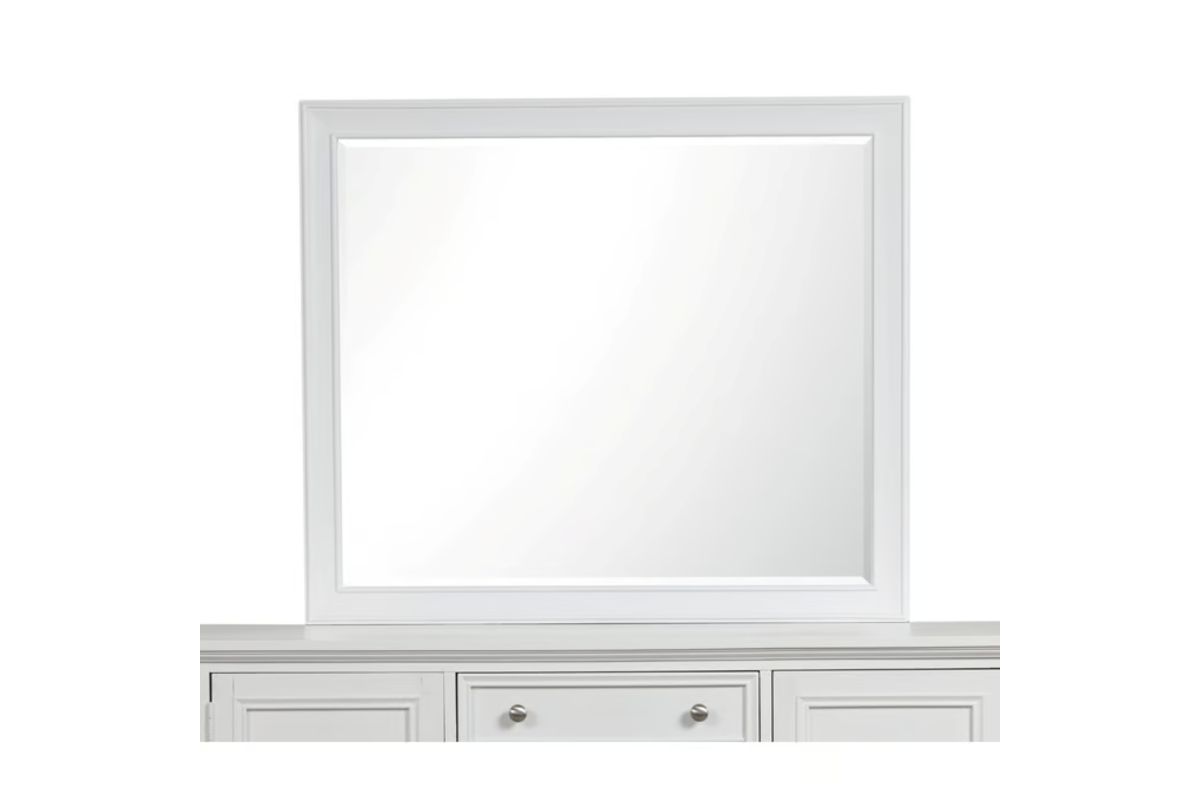 The Jamestown Dresser Mirror in White is a perfect blend of durability and style, designed to complement any bedroom decor. Expertly crafted from solid Acacia, premium manufactured woods, and authentic Oak veneers, this mirror ensures long-lasting durability while maintaining the natural elegance of real wood. The Jamestown collection exudes modern coastal charm with its clean, contemporary lines and crisp, brushed white finish, bringing a serene, beach-inspired ambiance to your space. The mirror features a pristine, low-distortion beveled glass that is beautifully encased in picture frame-style moldings, offering a clean and sophisticated look that enhances the overall aesthetic of any room. This elegant mirror not only serves as a functional piece but also adds a touch of refinement to your bedroom. No assembly required. What's Included: (1) Mirror