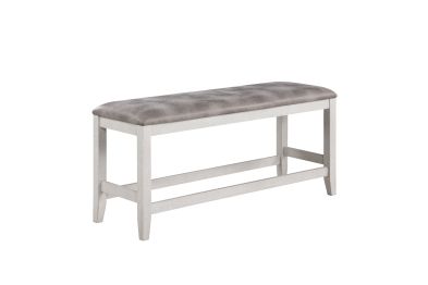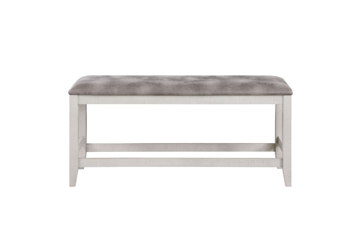 The Richland Counter Bench in Stonewash Gray is a versatile seating option that blends durability, comfort, and style. Expertly crafted from solid Rubberwood, durable manufactured woods, and genuine Acacia wood veneers, this bench is built to withstand everyday use while showcasing the natural beauty of real wood. The hand-applied vintage cream finish highlights the unique grain patterns, giving it a timeless and classic appeal. The plush upholstered seat cushion provides a cozy and inviting place to sit, making it perfect for family meals or casual gatherings. Pair it with the Richland dining set or use it as a standalone piece for added seating with style. Assembly required.