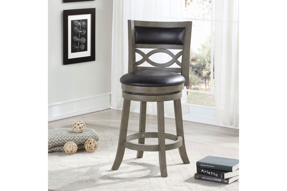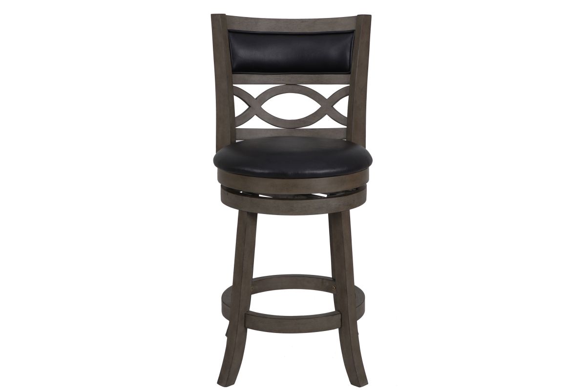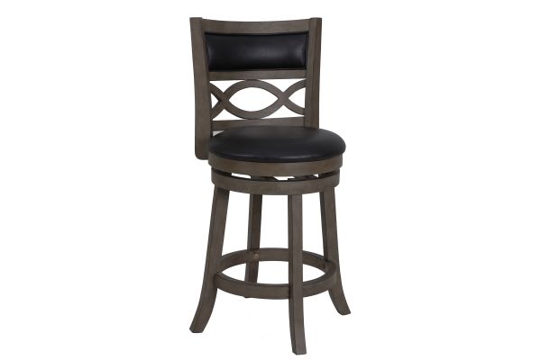 The New Classic Furniture Manchester Counter Height Swivel Bar Stool is a functional and durable seating solution designed for comfort and style. Crafted from quality Rubberwood solids and manufactured wood, ensuring long-lasting strength. Featuring a seat height of 24", the stool's legs are reinforced by a circular footrest, providing added stability and functionality. With a 360-degree swivel, this barstool effortlessly rotates for convenient use at kitchen islands or bars. The full foam seat cushions and backrests, upholstered in easy-care black PU fabric, offer a plush and cozy seating experience. The distinctive interlocking wave wood back and thickly welted upholstery add a touch of sophistication to the overall design. Easy assembly is a snap with the included instructions. Elevate your bar, counter, or kitchen island with the Manchester Bar Stool, where durability meets distinctive style. Assembly required.