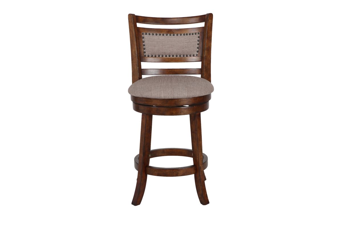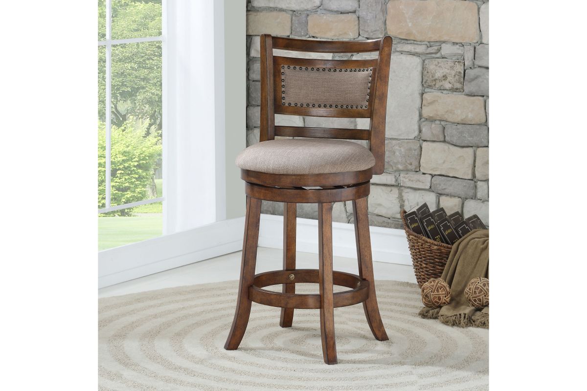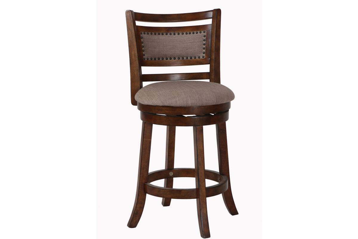 The New Classic Furniture Aberdeen Counter Height Swivel Bar Stool is crafted from quality Rubberwood solids and manufactured wood, ensuring long-lasting strength. The circular footrest adds stability and functionality to the stool legs, while the 360-degree swivel feature allows for convenient use at kitchen islands or bars. With a seat height of 24", the full foam seat cushions and backrests, upholstered in easy-care light brown 100% polyester fabric, provide a plush and cozy seating experience. The distinctive style is highlighted by the neatly upholstered backrest featuring a traditional nailhead trim. Assembly is a breeze with the included instructions, and a one-year warranty ensures your satisfaction. Elevate your bar or kitchen island with the Aberdeen Bar Stool, where quality construction meets distinctive style. Assembly required.