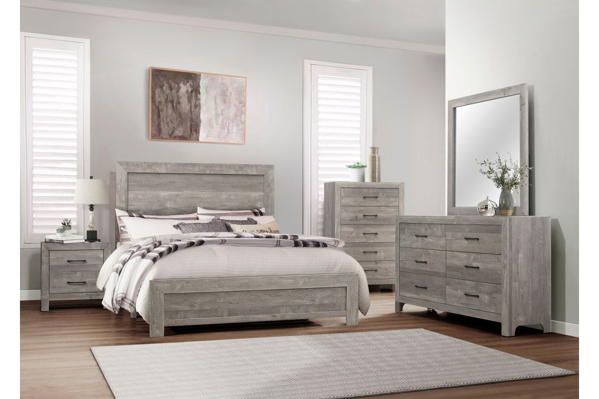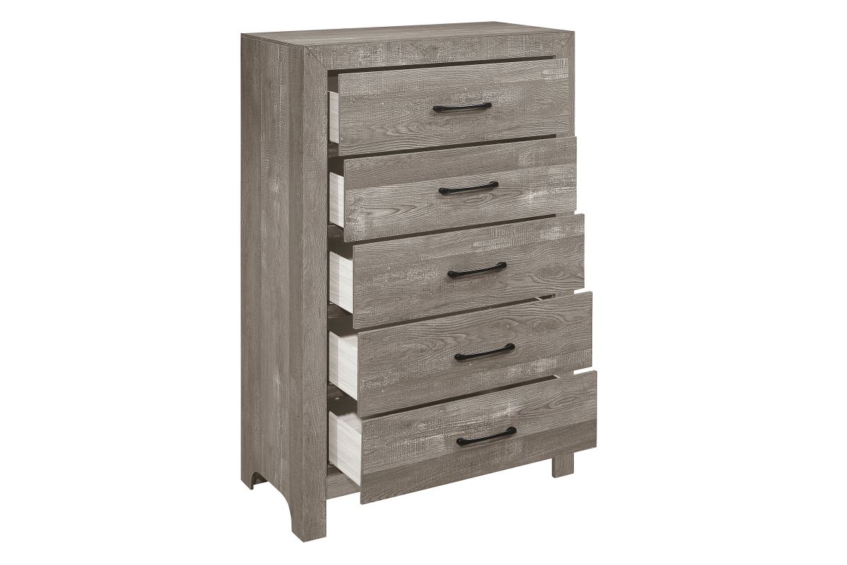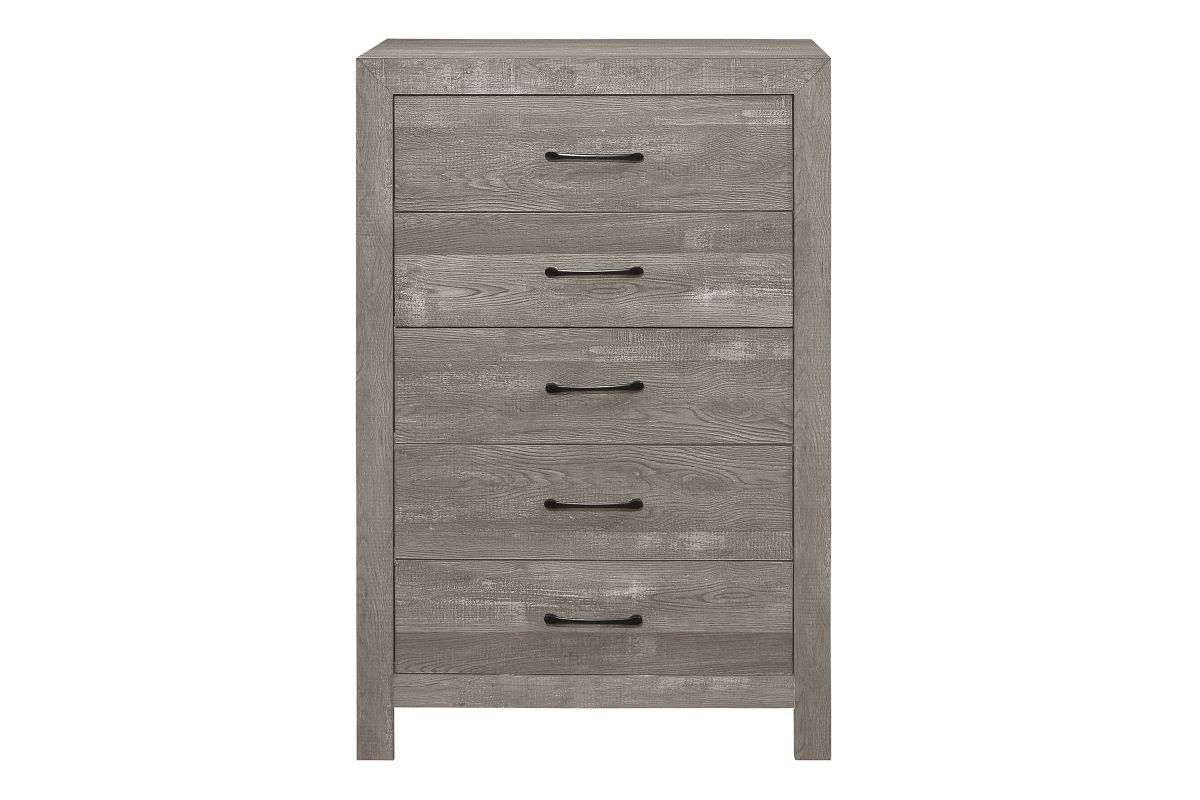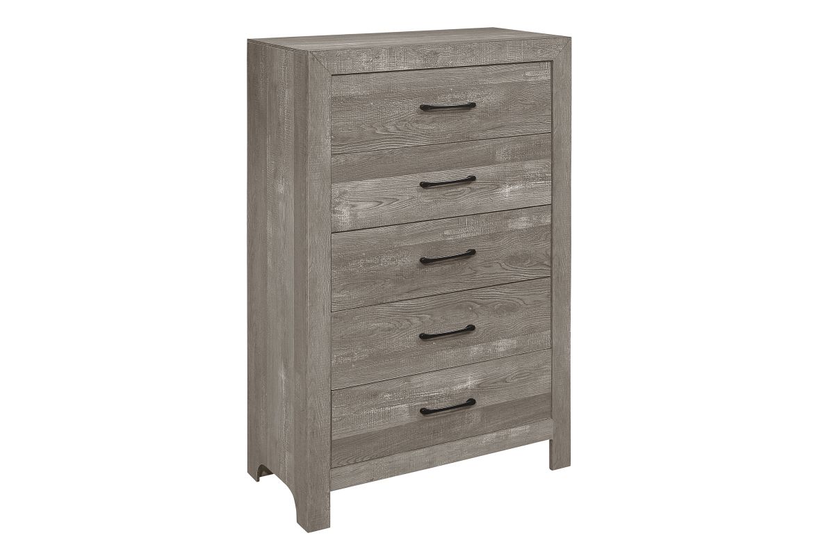 Modern lines and rustic styling are paired to create the look of the Corbin Collection. The 3D printed paper veneer's texture is highlighted by a gray finish for a realistic wood look. Providing complementing contrast, the drawer fronts of the chest feature black metal hardware. Subtle framing defines the profile of the chest, further lending to the unfettered design of the collection. No assembly required.