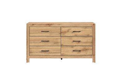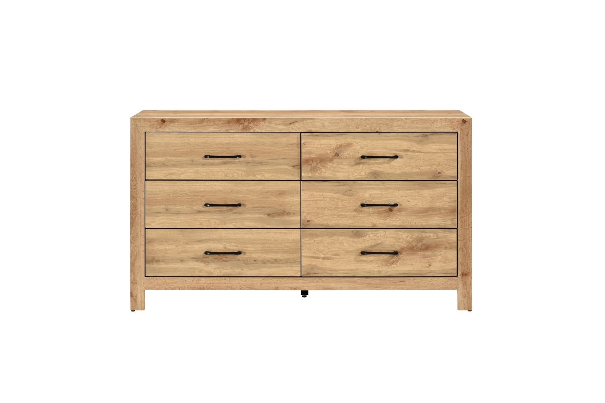 Elevate your bedroom's storage and style with this spacious 6-drawer dresser, showcasing a beautiful natural finish that exudes rustic charm. Expertly crafted from a durable blend of faux wood veneer, wood, and engineered wood, this dresser is built for lasting quality. It features six generously sized drawers, each with robust dovetail construction and smooth metal-on-metal center glides for effortless operation, all accented by sleek black nickel-tone bar pulls. Best of all, this dresser arrives completely assembled, ready to use right out of the box. The top surface is further protected by a melamine laminate, offering superior resistance to everyday scratches and stains, ensuring your dresser maintains its pristine appearance for years to come.