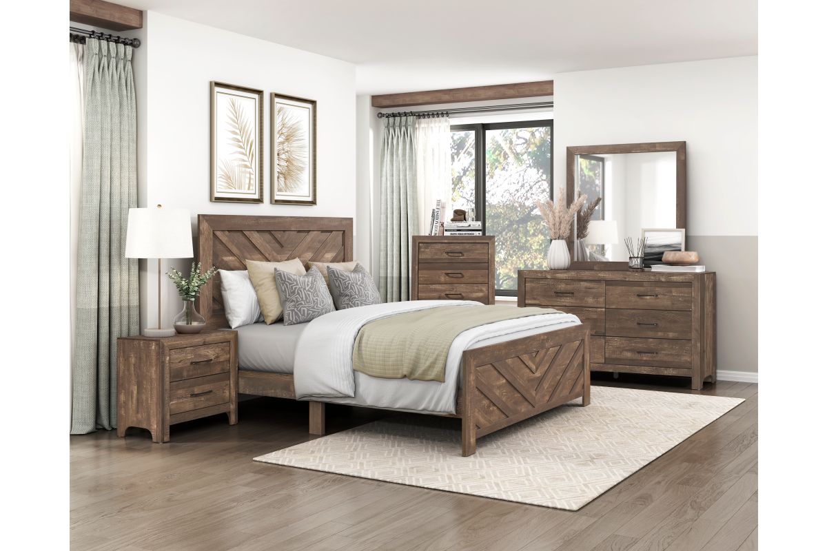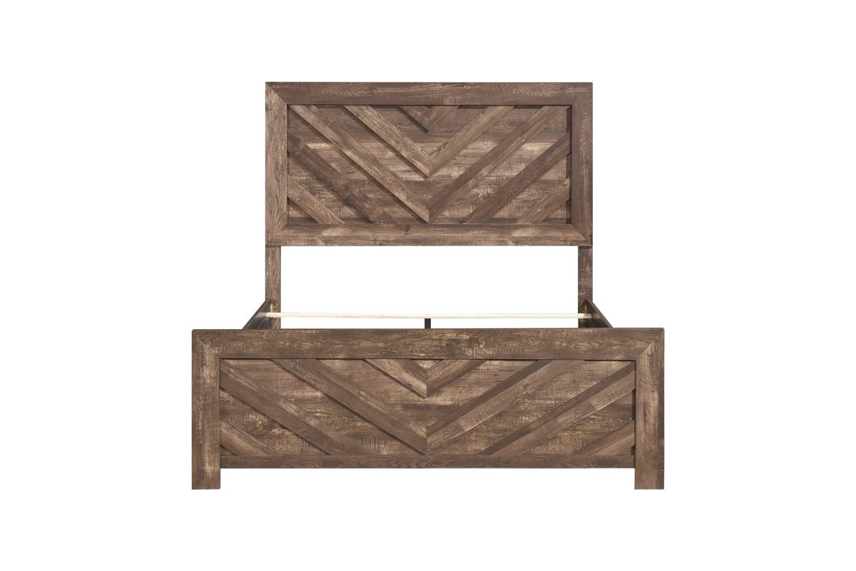 Modern lines and rustic styling are paired to create the look of the Corbin Collection. The 3D printed paper veneer’s texture is highlighted by a brown finish for a realistic wood look. A bold V-pattern defines the face of the California King panel headboard and footboard, further lending to the unfettered design of the collection. The bed’s construction allows for convenient packaging within one box. Assembly required.
