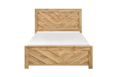 Elevate your bedroom with the distinctive style of this modern natural wood finish bed frame, featuring a striking chevron pattern on both the headboard and footboard. This "Bed in a Box" solution offers a complete and stylish foundation for your mattress, crafted from a durable blend of faux wood veneer, wood, and engineered wood for lasting quality. The warm natural finish beautifully highlights the intricate chevron design, creating a focal point in any room. Designed for convenience, it includes the headboard, footboard, and rails, ships efficiently in one compact box, and requires assembly, making it a perfect choice for those seeking contemporary aesthetics with practical delivery (foundation/box spring required).