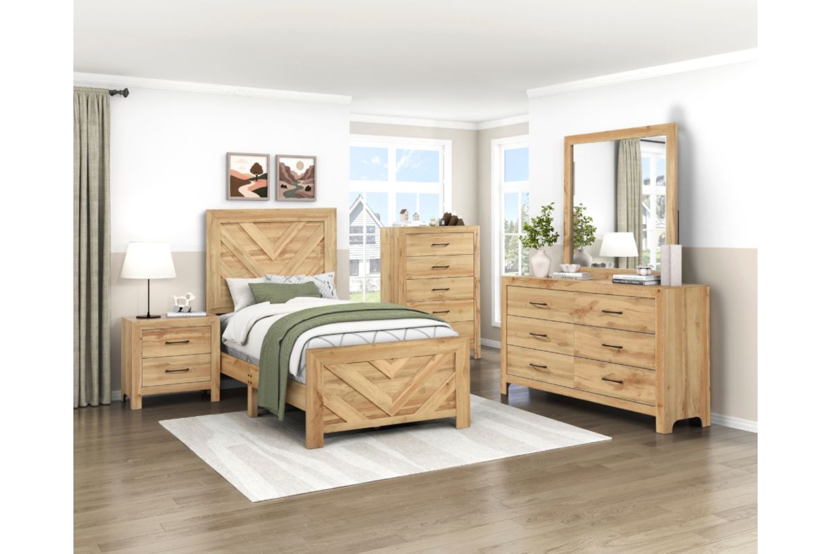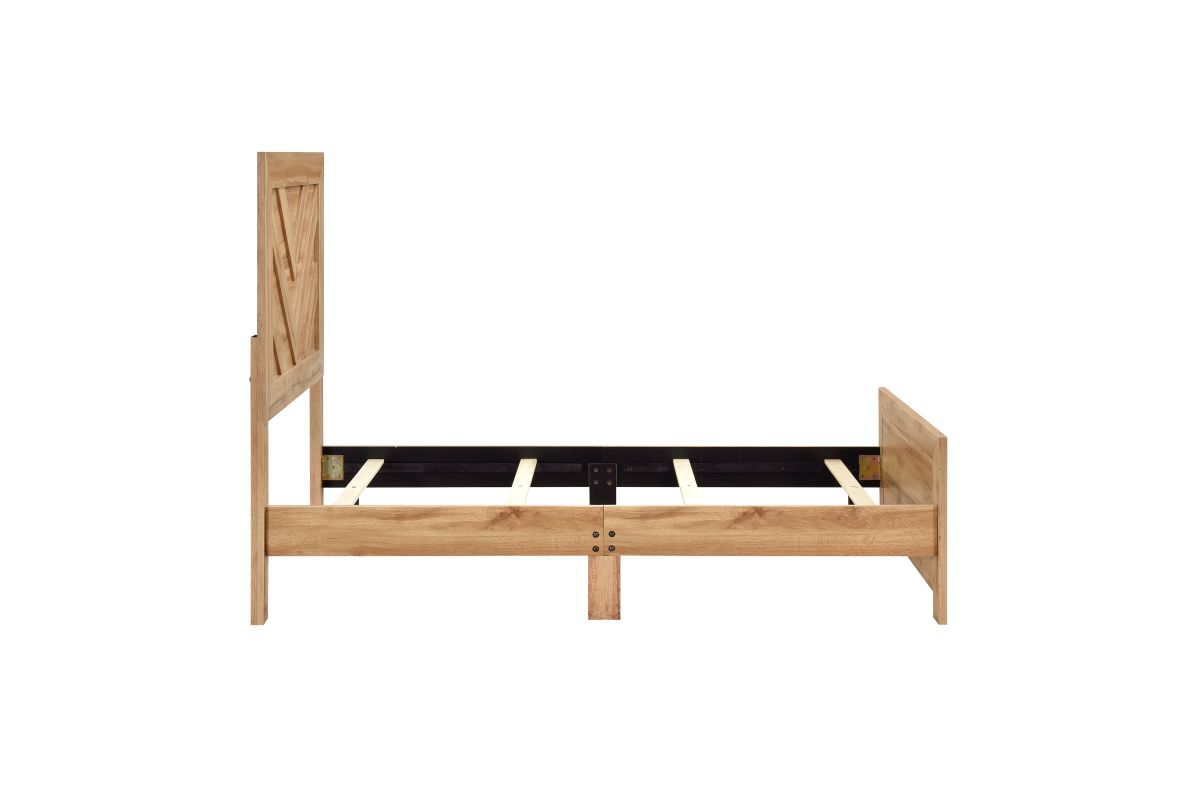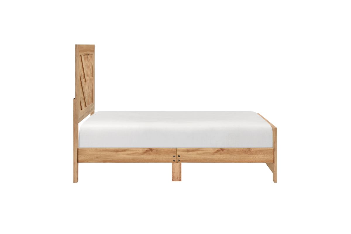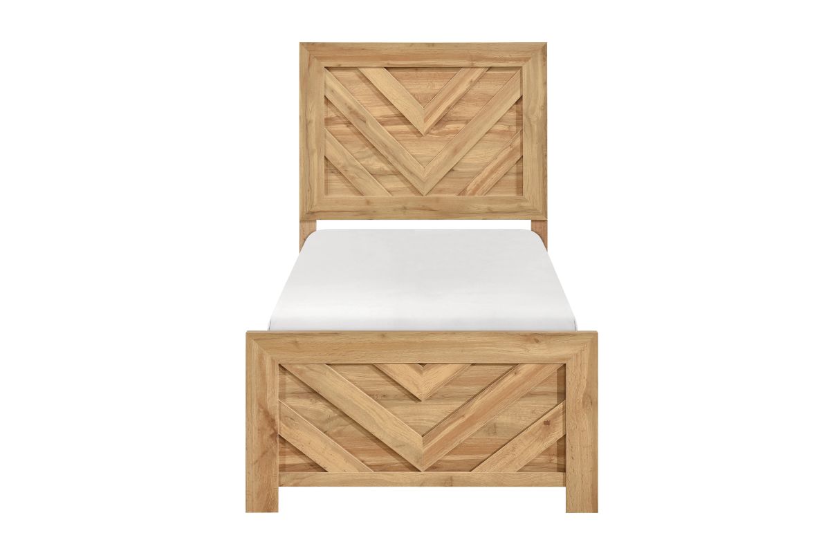 Elevate your bedroom with the distinctive style of this modern natural wood finish bed frame, featuring a striking chevron pattern on both the headboard and footboard. This "Bed in a Box" solution offers a complete and stylish foundation for your mattress, crafted from a durable blend of faux wood veneer, wood, and engineered wood for lasting quality. The warm natural finish beautifully highlights the intricate chevron design, creating a focal point in any room. Designed for convenience, it includes the headboard, footboard, and rails, ships efficiently in one compact box, and requires assembly, making it a perfect choice for those seeking contemporary aesthetics with practical delivery (foundation/box spring required).