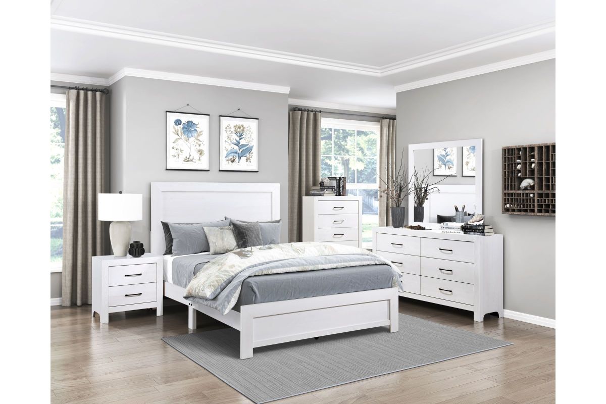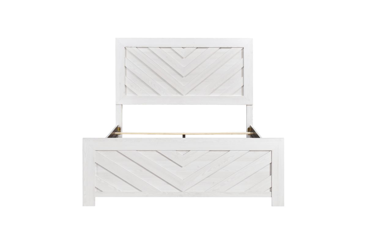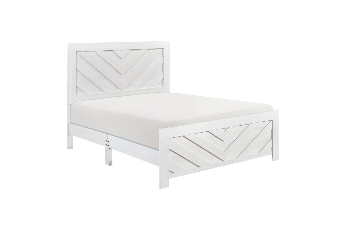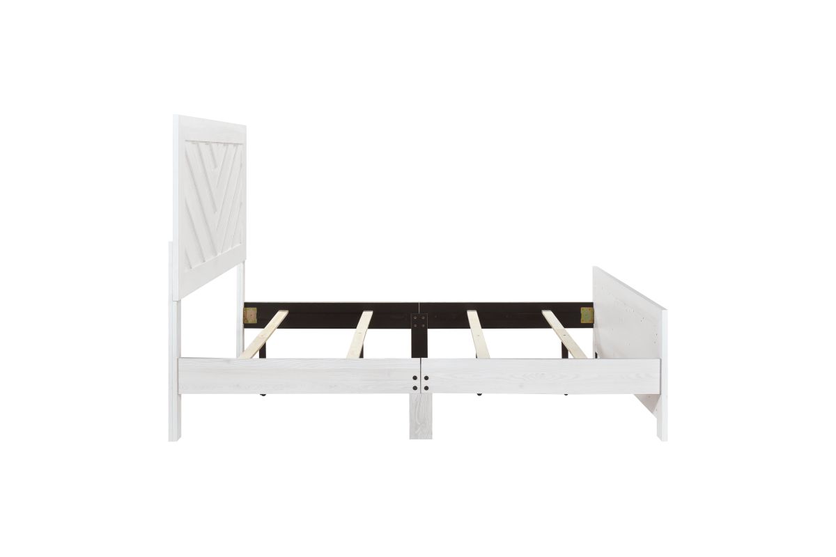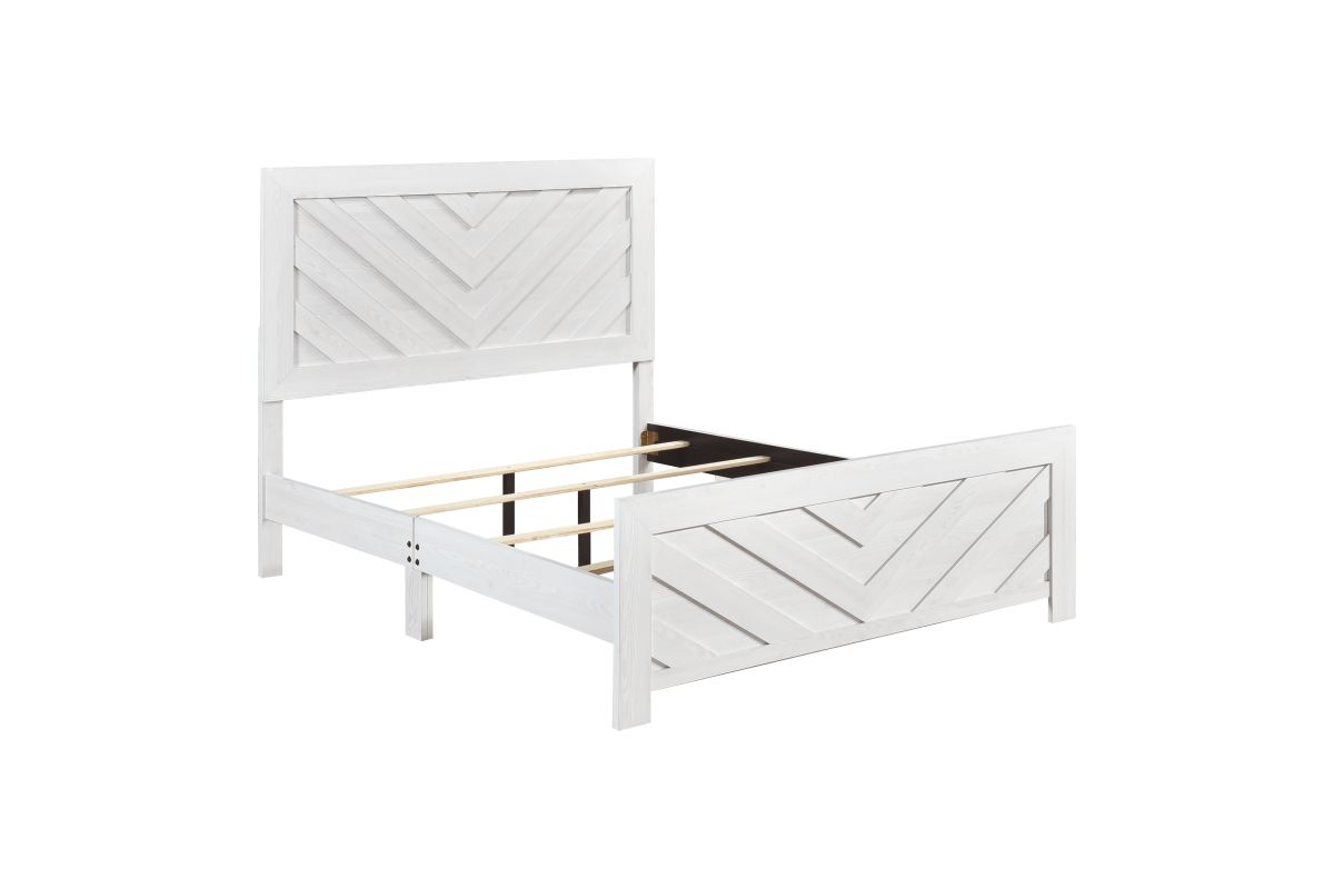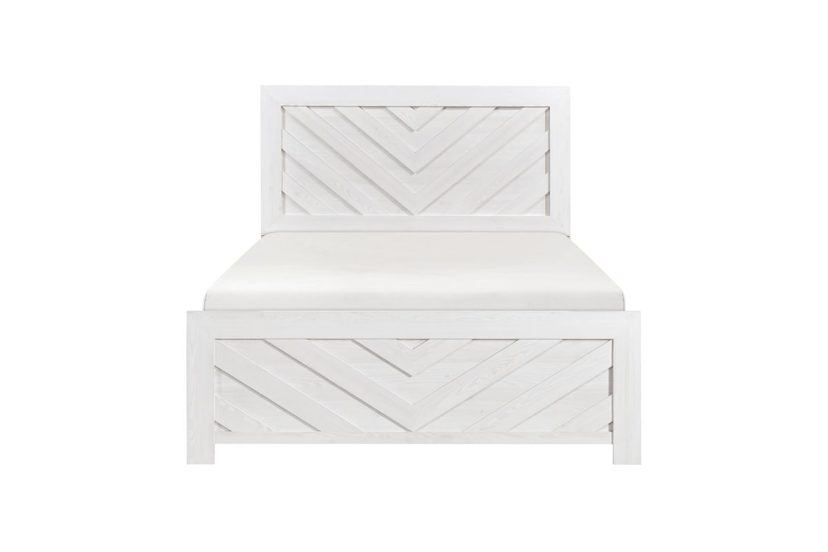 Modern lines and rustic styling are paired to create the look of the Corbin Collection. The 3D printed paper veneer's texture is highlighted by a white finish for a realistic wood look. A bold V-pattern defines the face of the Eastern King panel headboard and footboard, further lending to the unfettered design of the collection. The bed's construction allows for convenient packaging within one box. Assembly required.