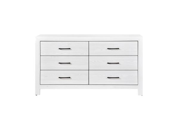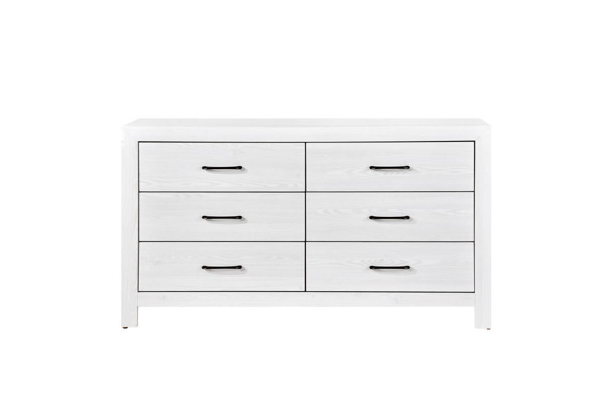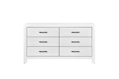 Modern lines and rustic styling are paired to create the look of the Corbin Collection. The 3D printed paper veneer's texture is highlighted by a white finish for a realistic wood look. Providing complementing contrast, the drawer fronts of the dresser feature black metal hardware. Subtle framing defines the profile of the dresser, further lending to the unfettered design of the collection. No assembly required.