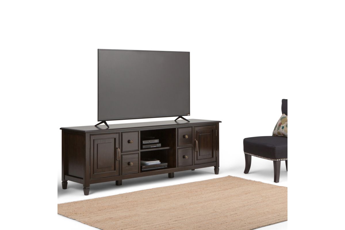 Now that 80 inch flat screen TVs are more affordable, you need to have one. To enjoy it fully, you will also need the perfect TV Stand to position your TV just right. Look no further. The Connaught Extra Wide TV Stand is perfectly sized for TVs up to 80 inches. It has plenty of storage space for all your media and gaming devices. It has a large centrally located open area with four side drawers as well as two enclosed spaces. The two large side storage cabinets open to one adjustable shelf. The unit features cord management cut-outs for easy installation of TV and media components. Assembly required.