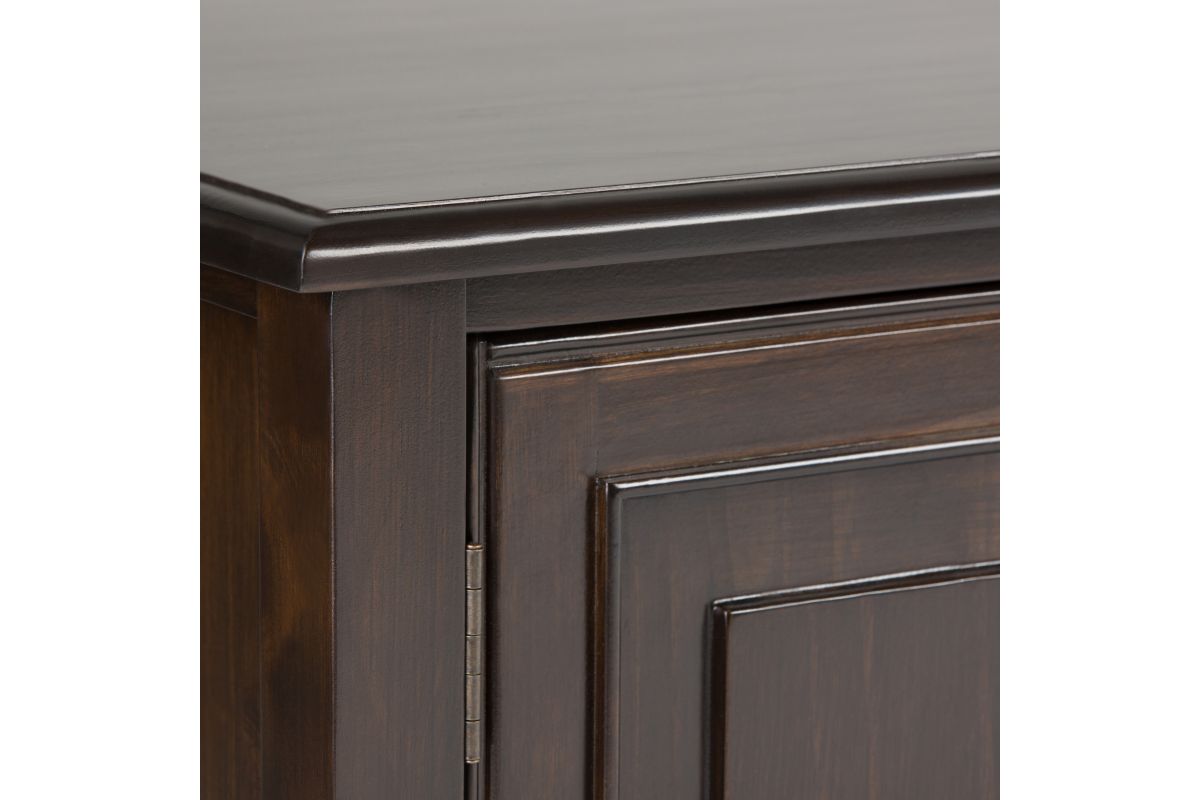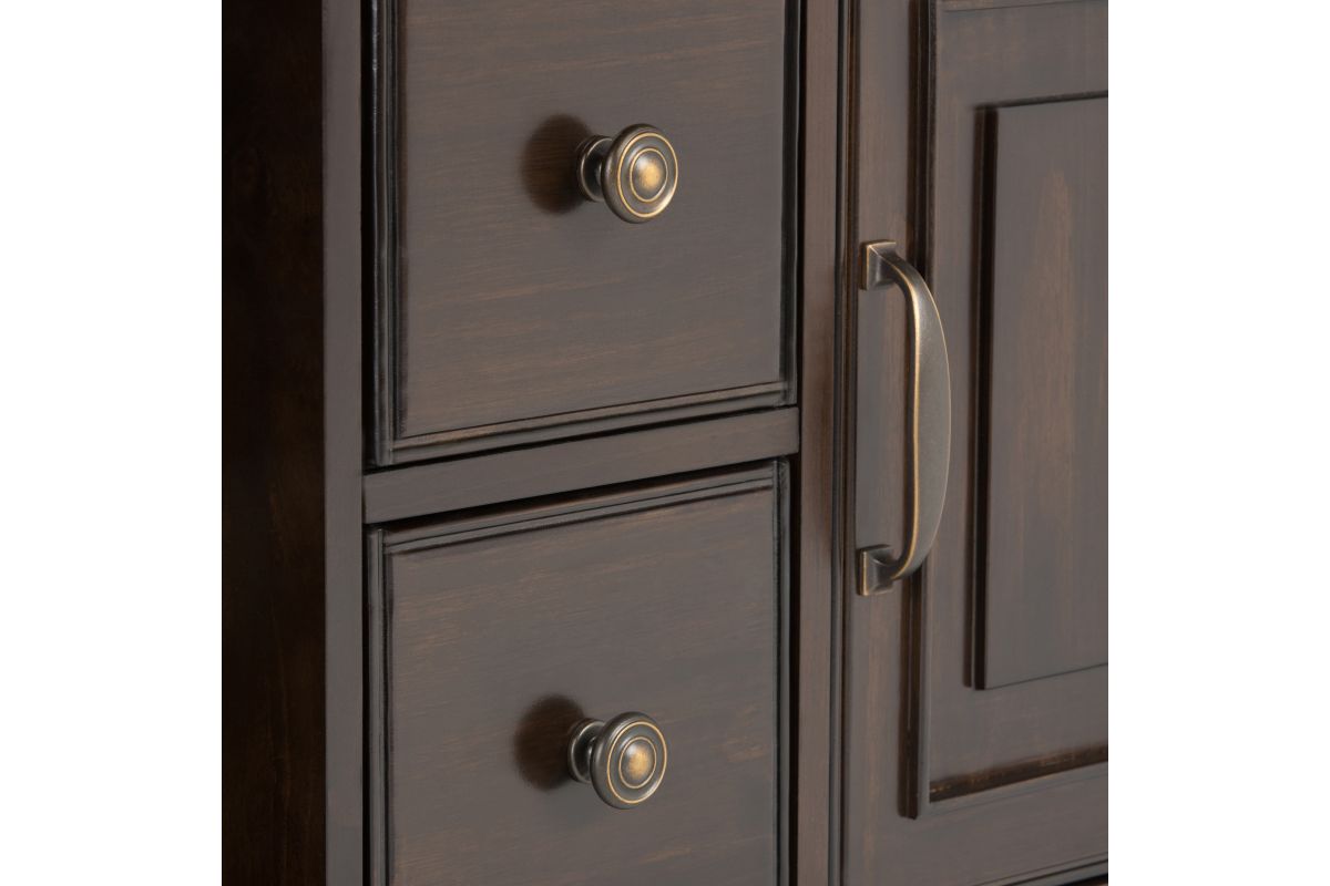 - Traditional style Includes vintage raised panel doors and drawers, notched legs, Bronze decorative hardware and metal drawer glides