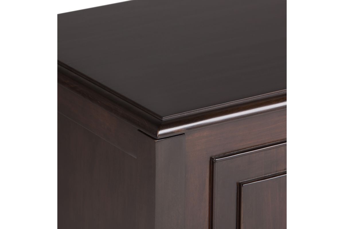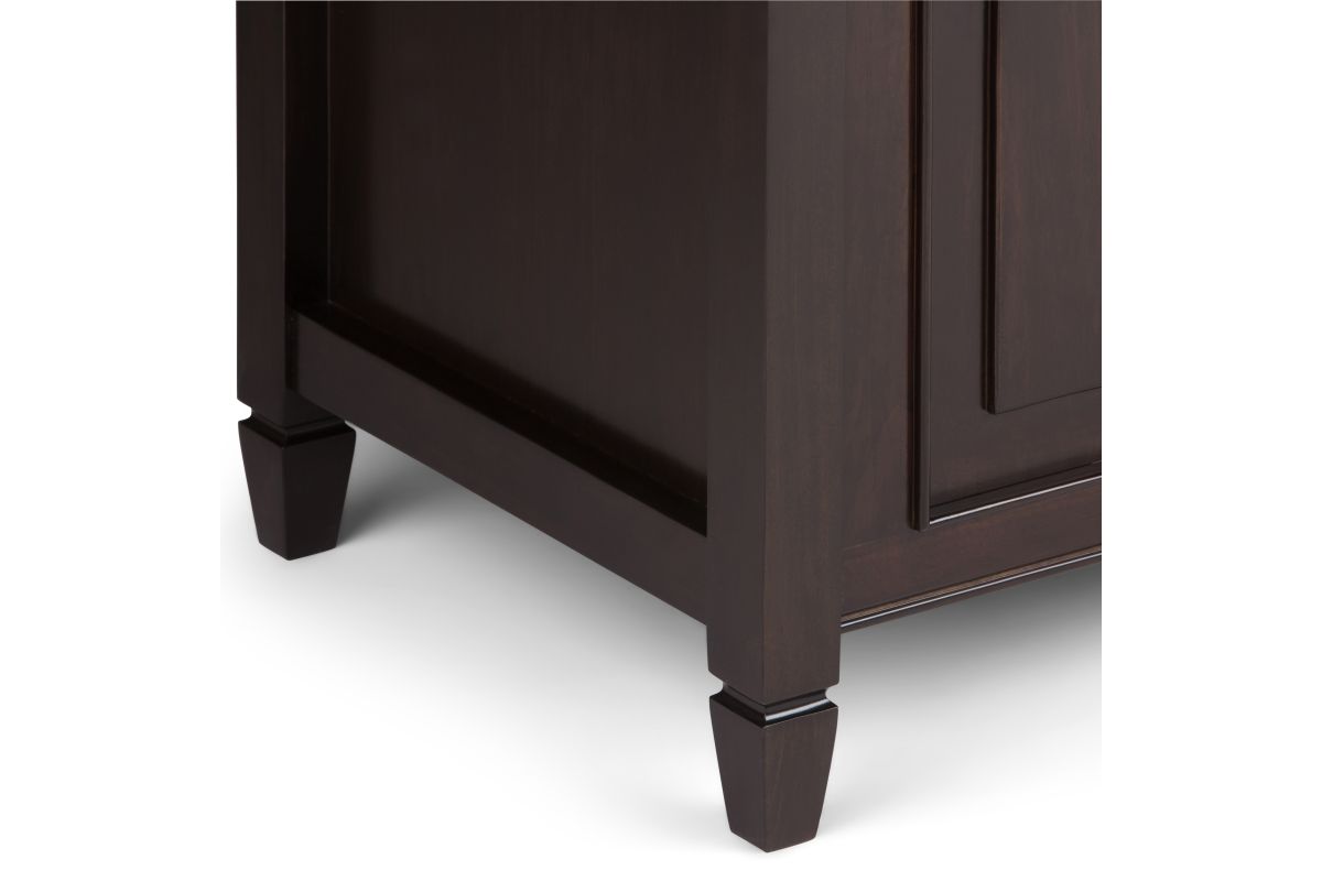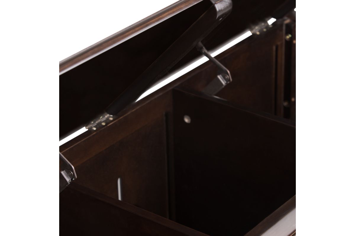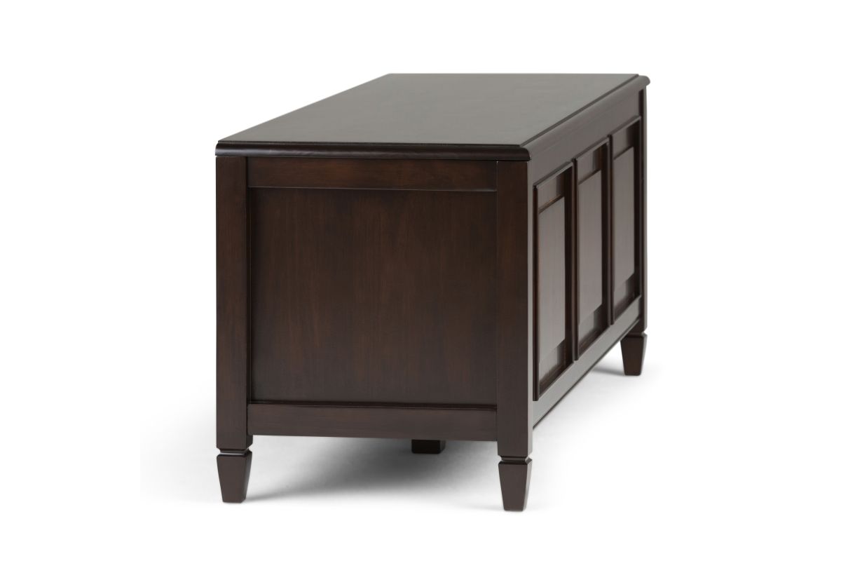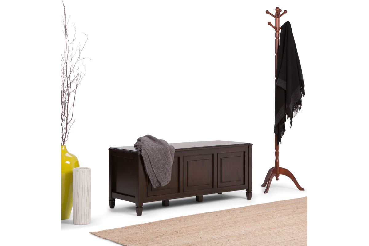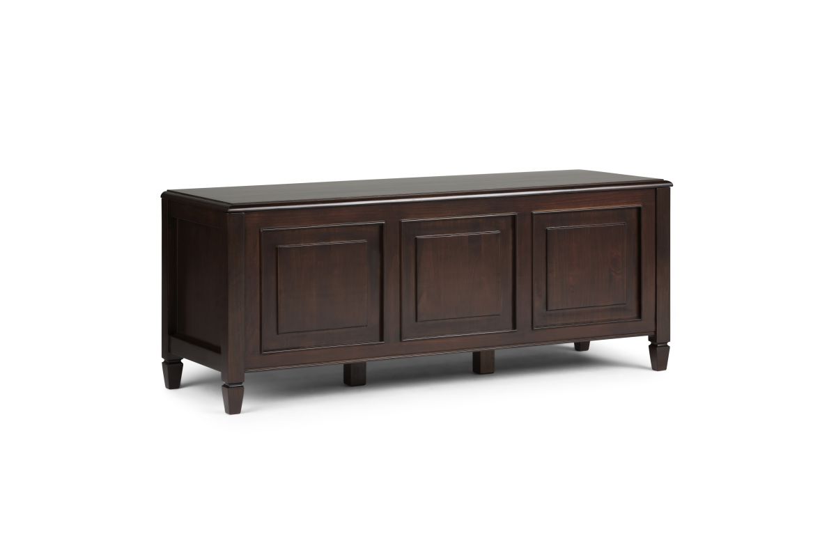Overwhelmed by junk? Need help organizing the clutter and keeping it out of sight? The Connaught Storage Bench Trunk is a versatile furniture piece that can be used throughout your home. Whether in the family room, bedroom, hallway, kids room, or den, this trunk is the perfect solution to store anything. Its lid with child safety hinges opens to reveal three large storage compartments. Beautifully crafted from solid wood with a Dark Chestnut Brown stain, its classic design details lend a timeless look to any room. Assembly required.