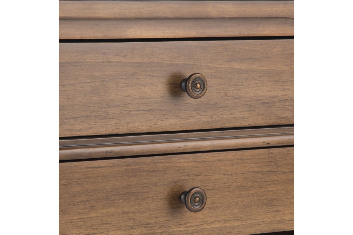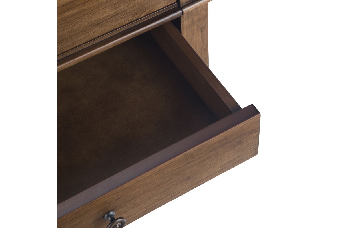 - Transitional design includes defined double molded top, tapered table legs, flat panel drawer fronts and antique bronze rounded decorative handles
