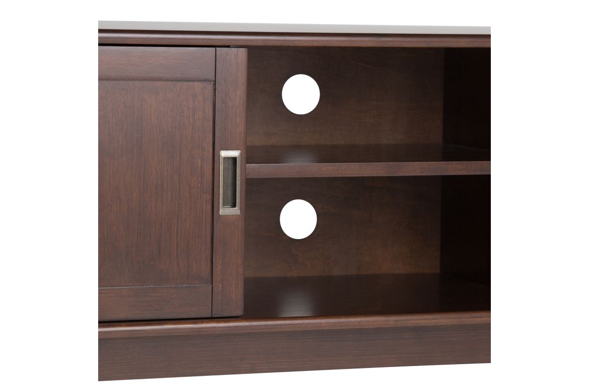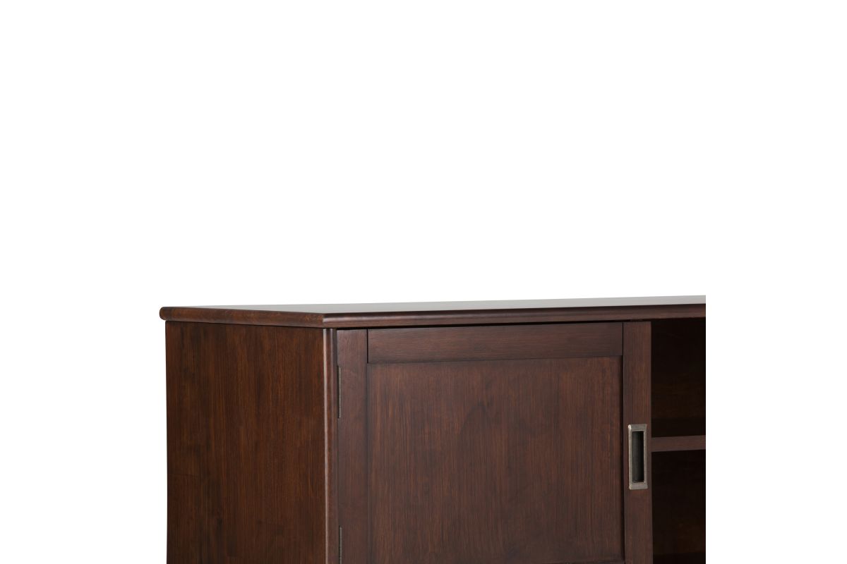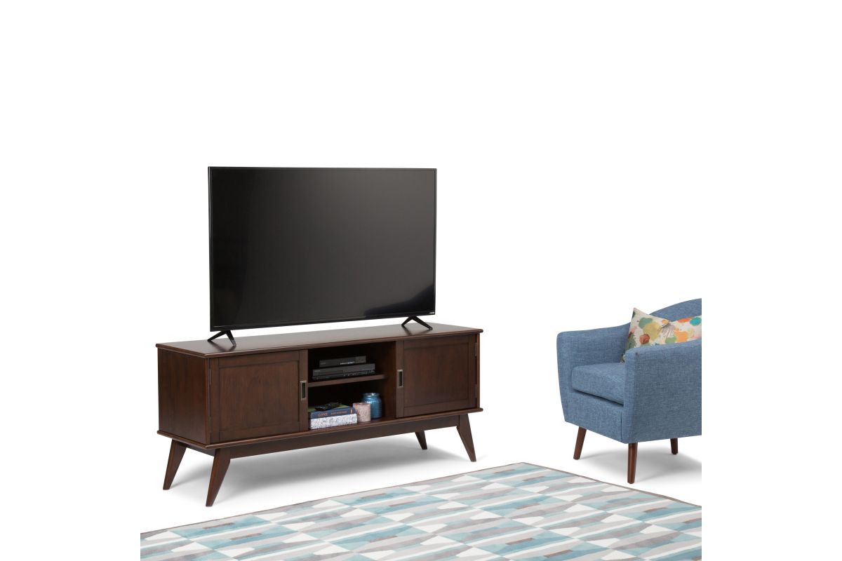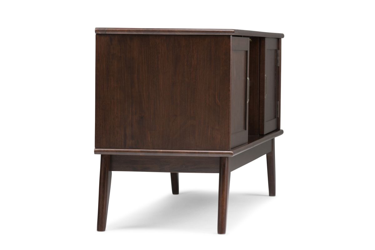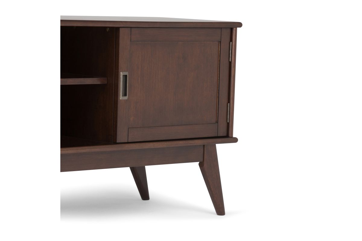 Your TV deserves a stylish and sturdy stand. The Draper Mid Century modern Low TV Media Stand is a well-designed piece of furniture. The center features two shelves with cable management cutouts for your electronics. Two side cabinets each have one adjustable shelf for your DVD or game collection. This 26” high stand can accommodate a TV up to 65”. Assembly required.