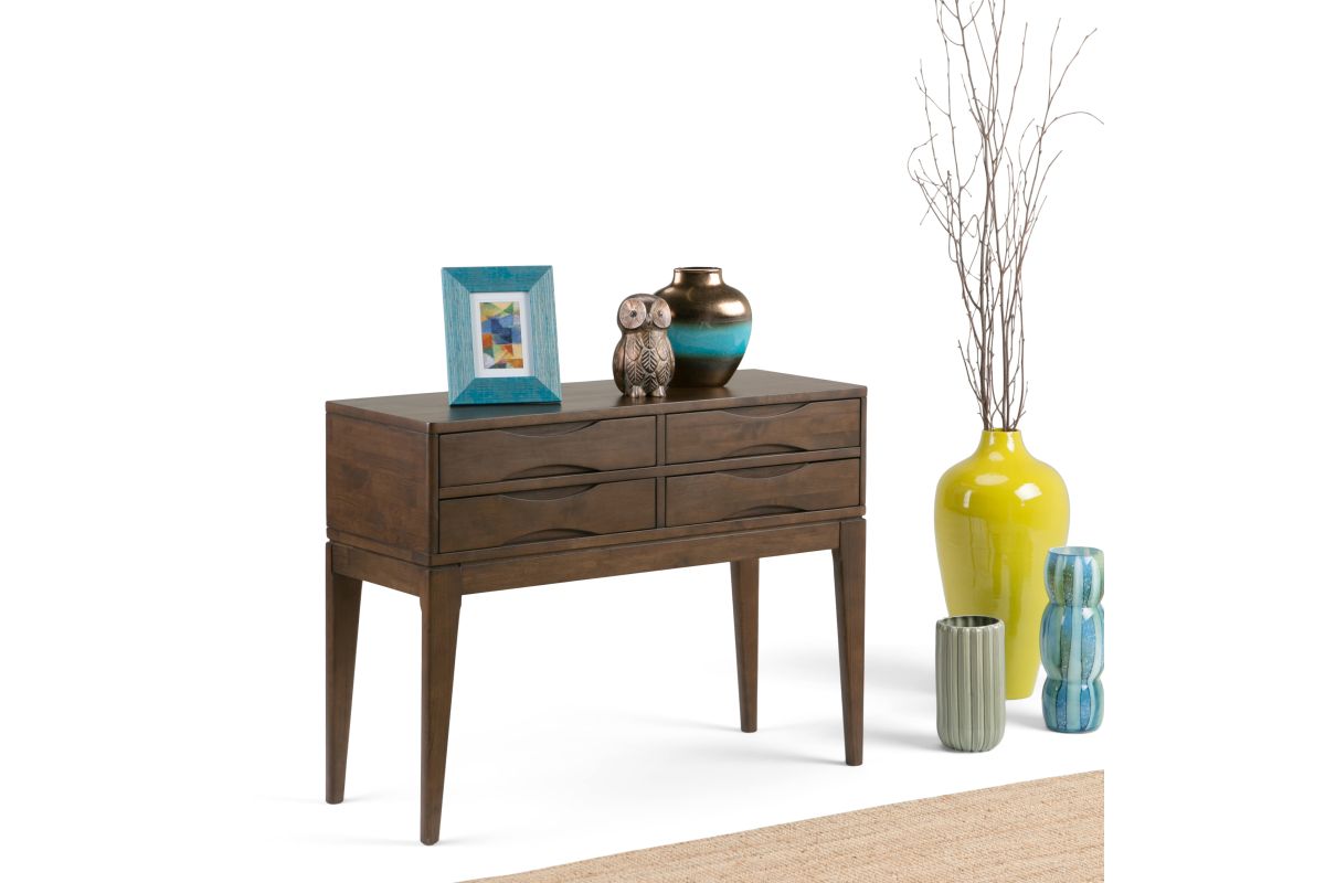 Update your home decor with the Harper Hallway Console Table. The hallway console table is crafted of solid hardwood with a rich finish. This mid-century style table is perfect to decorate an entryway or use as a sofa table. It features four notched drawers to take care of all your storage needs. The spacious top surface provides ample room to place decorations for all occasions. Assembly required.