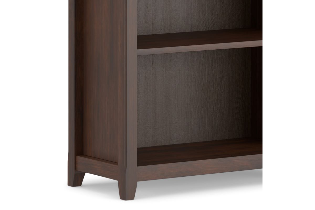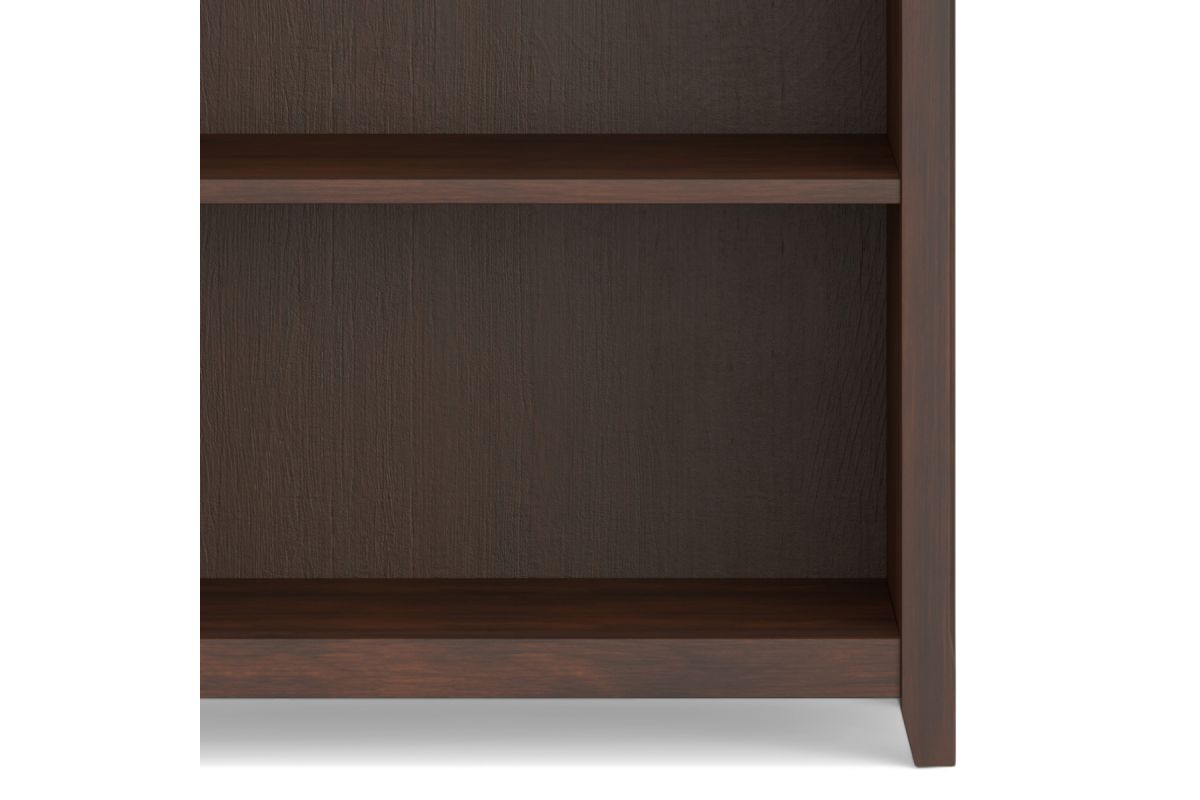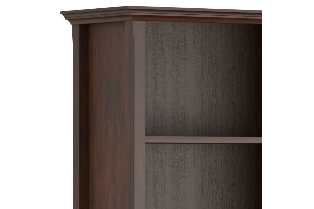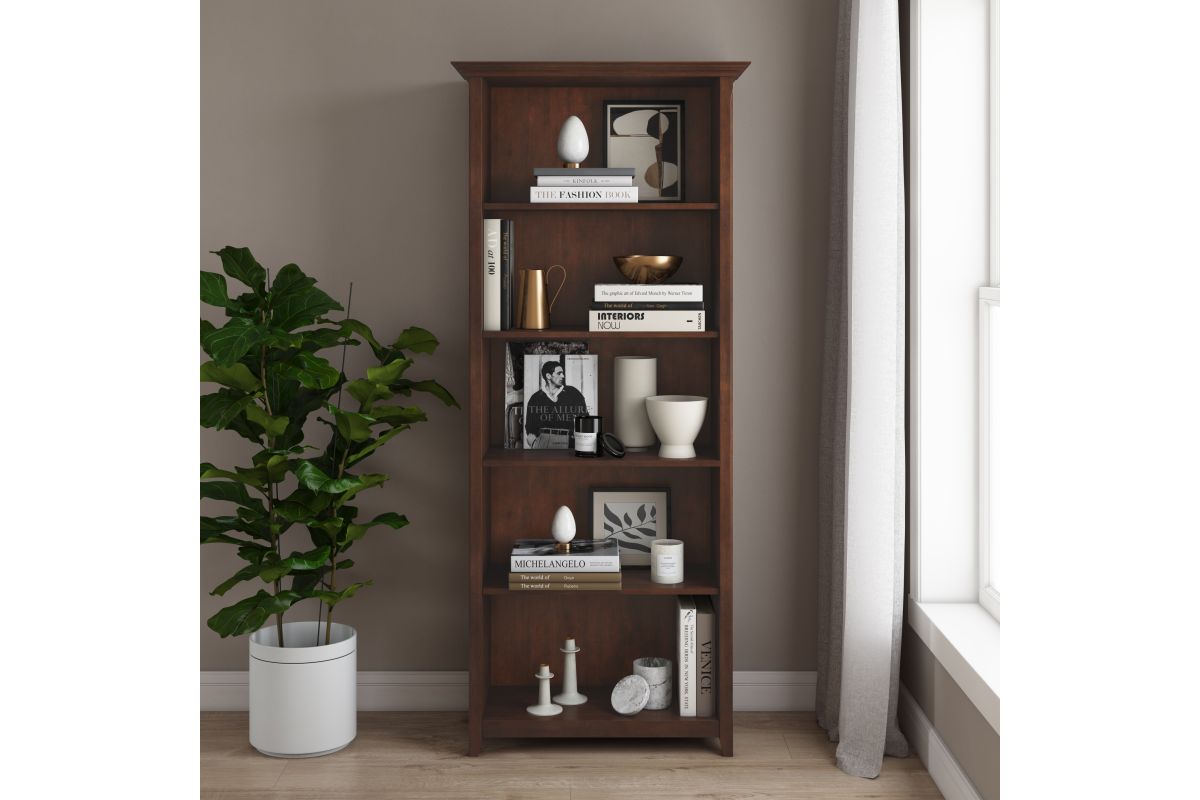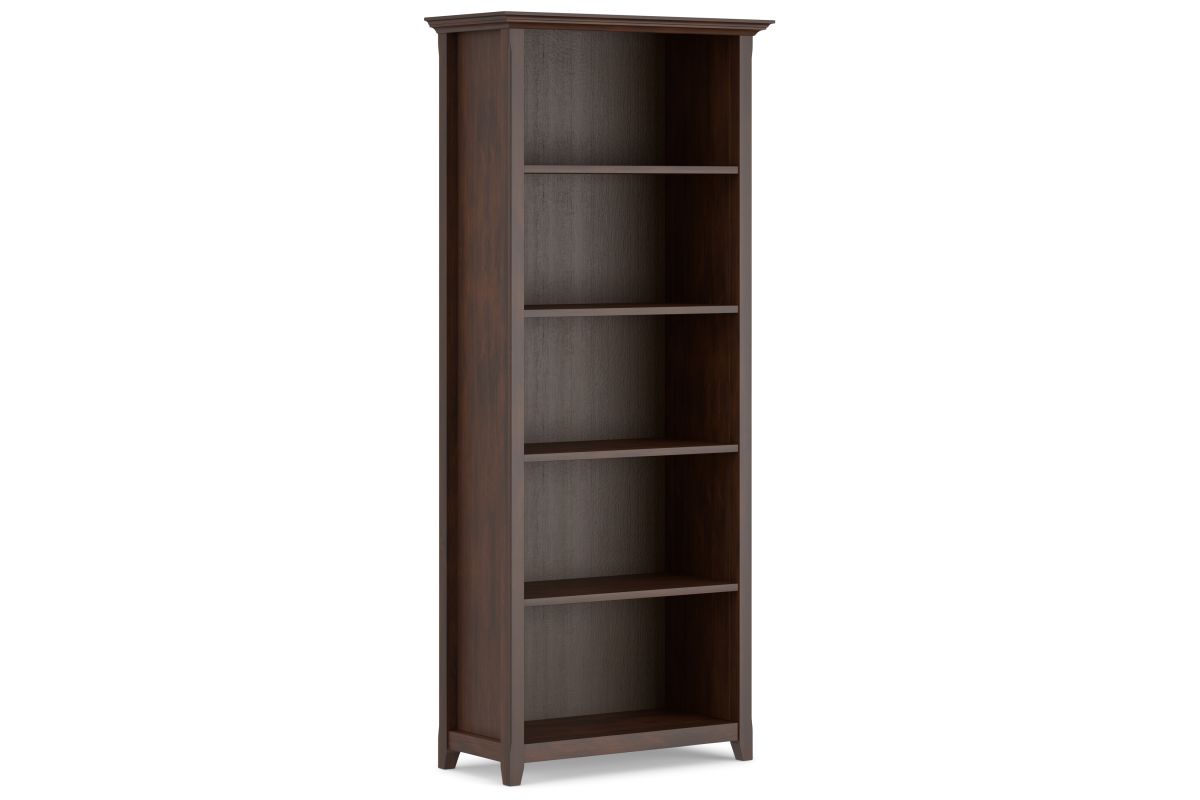 Timeless craftsmanship meets versatile functionality in the Amherst 5 Shelf Bookcase. Handcrafted from solid pine wood, this tall bookshelf features a russet brown finish, accentuating its natural grain and warm, inviting aesthetic. Five adjustable shelves offer flexible storage, perfect for books, decorative pieces, or home office essentials. The crown molding detail and clean lines draw inspiration from transitional design, making this solid wood bookshelf a refined addition to living rooms, offices, or bedrooms. Built from sustainably sourced pine, kiln-dried to resist warping and cracking, this wooden bookcase delivers long-lasting durability while maintaining an eco-friendly footprint. Assembly required.