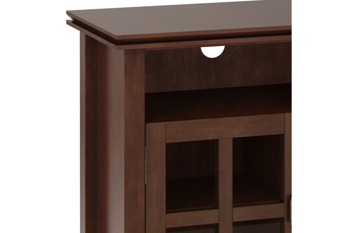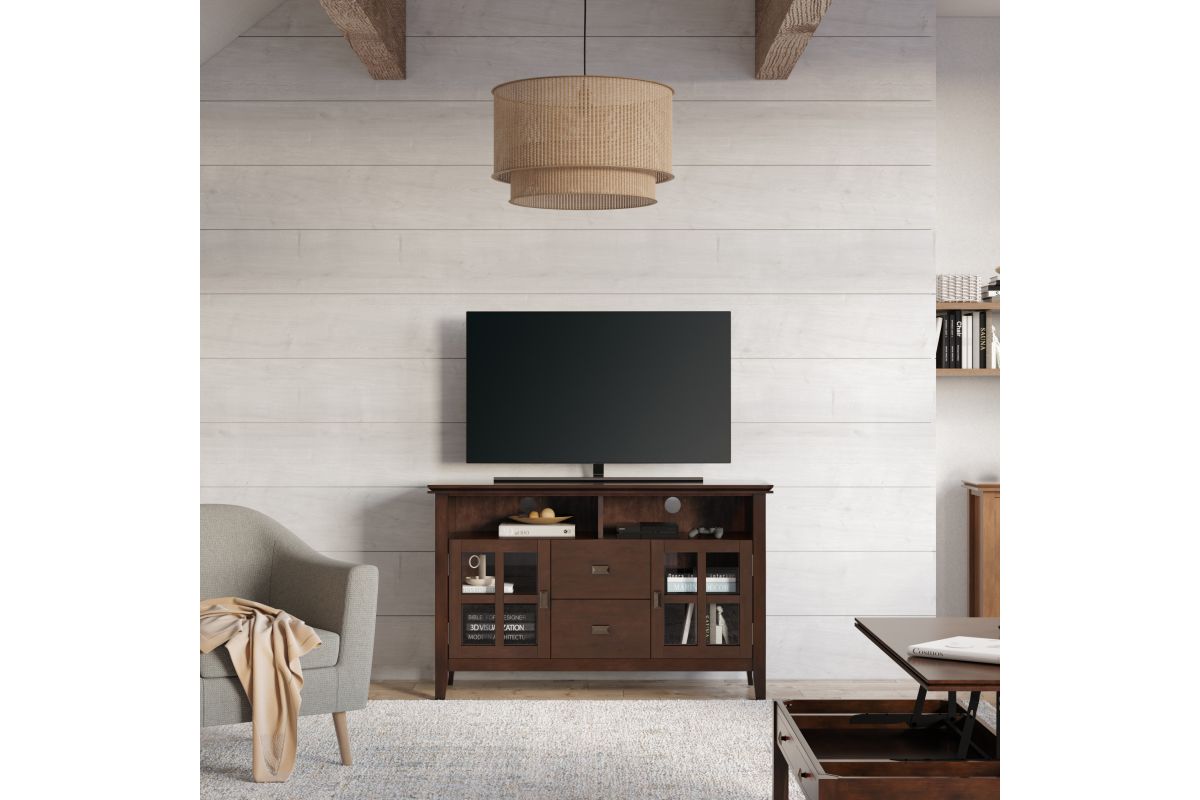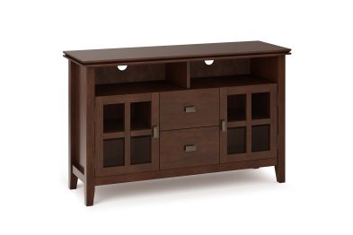 You just bought the ultimate flat screen TV. Now what to do? Hang it on the wall? No, you need the perfect TV Stand for storage and to enhance your viewing pleasure. Look no further than our most popular Artisan TV Stand. It is perfectly sized for TVs up to 55 inches. The 30-inch height puts the TV at a level that is ideal for comfortable viewing. The Artisan TV Stand has plenty of storage and space for all your media and gaming devices. It has a centrally located area with two open compartments and two drawers. The two side storage cabinets open to two adjustable shelves. The unit features cord management cut-outs for easy installation of TV and media components. Assembly required.