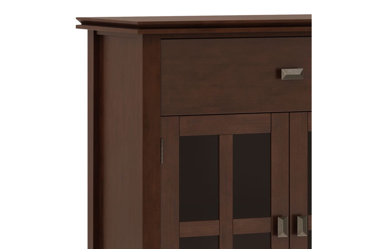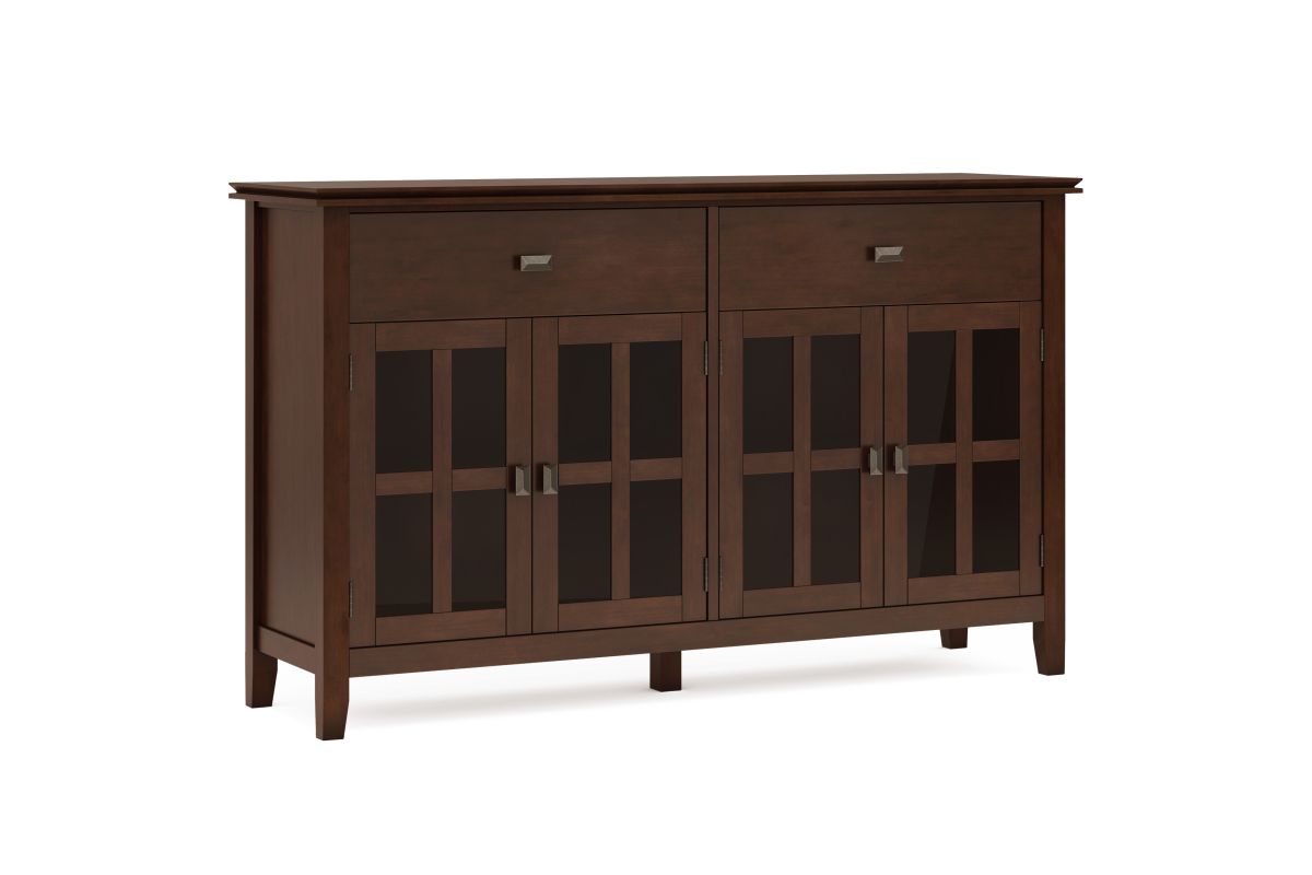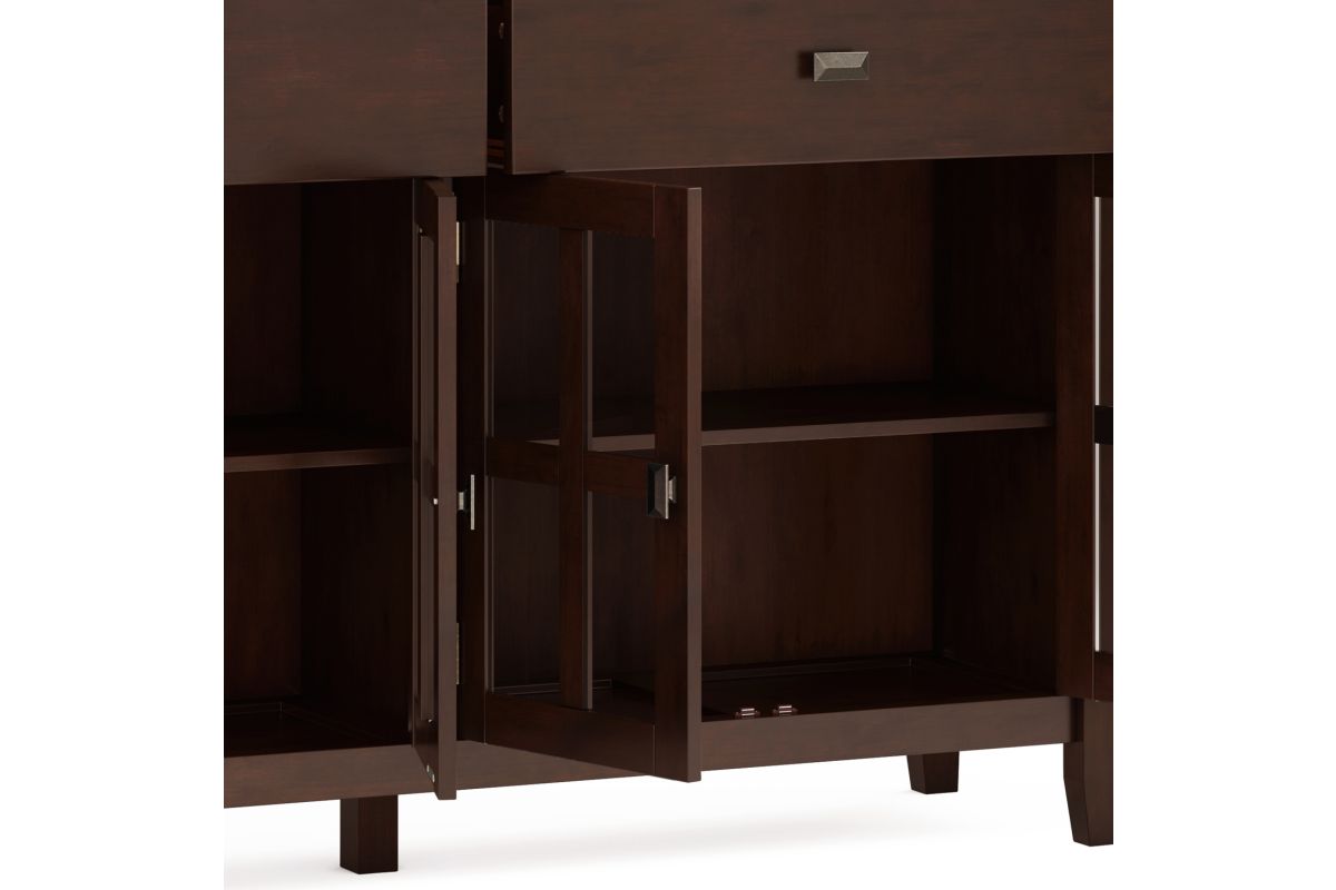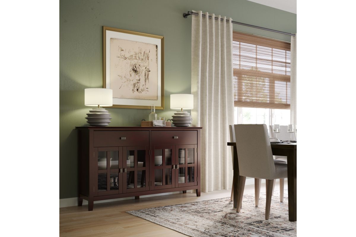Add timeless elegance to your home with the Artisan Large 4 Door Sideboard Buffet. This handcrafted piece showcases a rich, hand-applied finish that enhances the natural beauty of the solid wood frame. With four tempered glass-panel doors, adjustable shelves, and a spacious interior, it combines style and practicality, offering versatile storage for dining essentials, books, or electronics. Whether used in dining rooms or living spaces, the Artisan Buffet is a functional centerpiece that exudes warmth and sophistication. Assembly required.