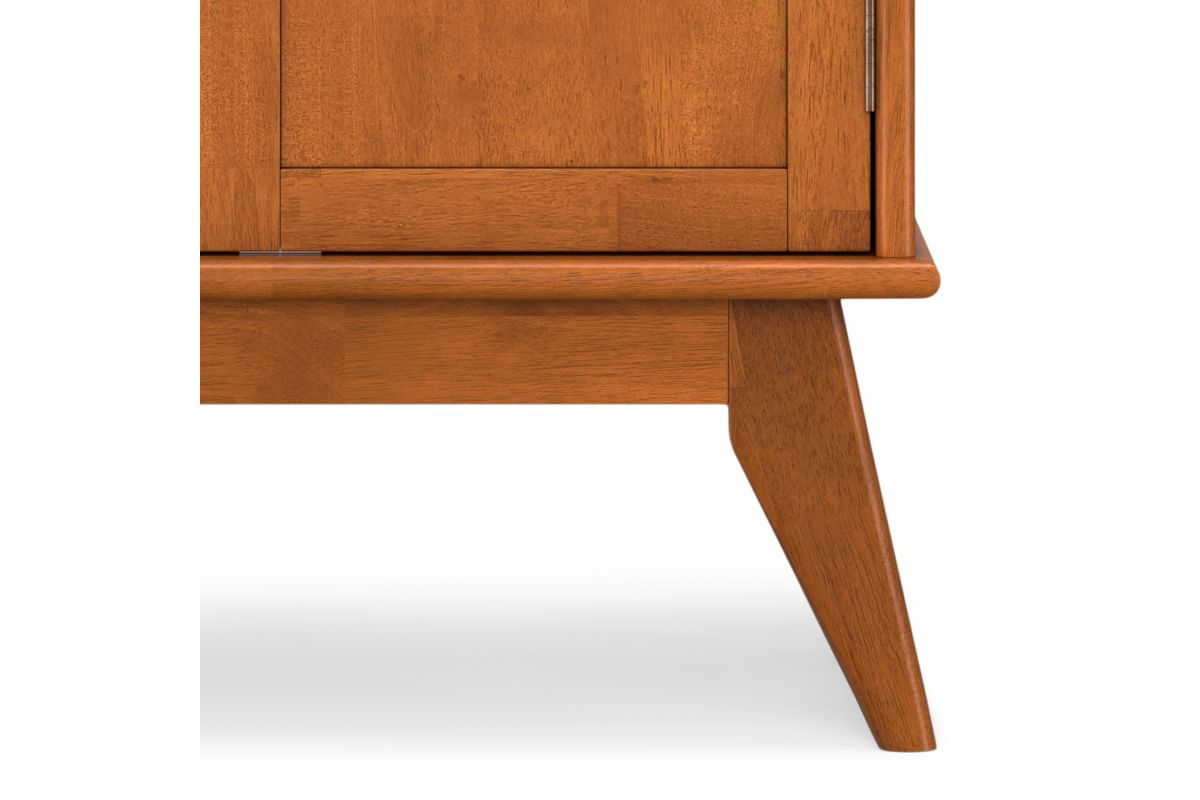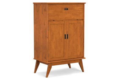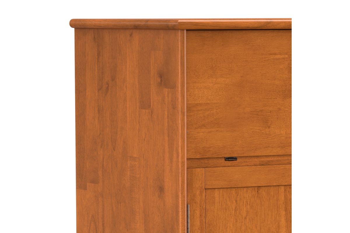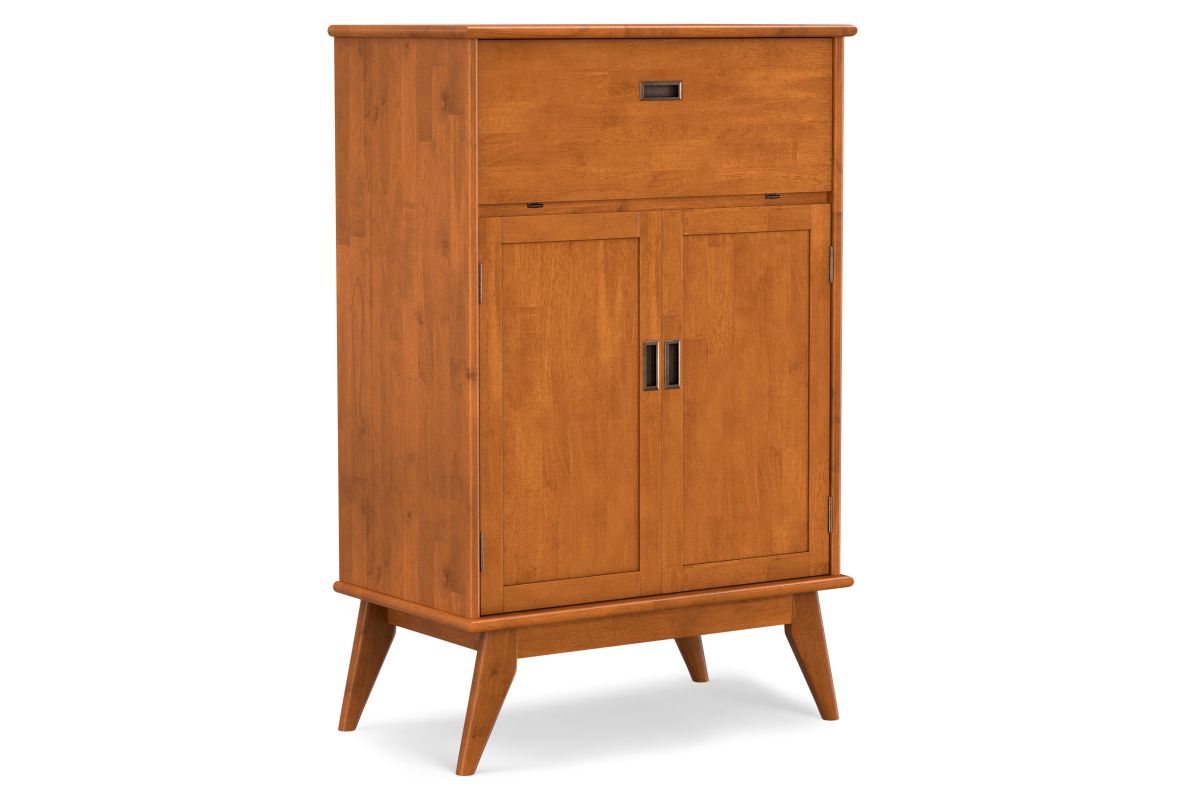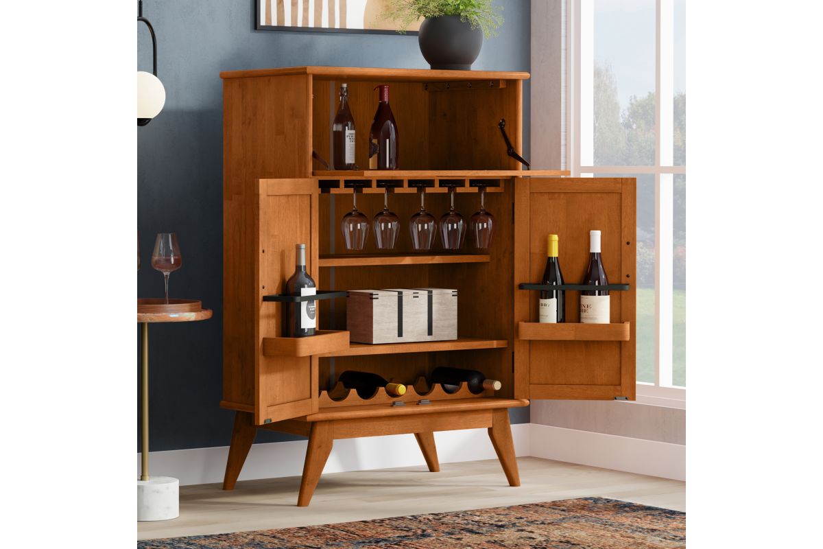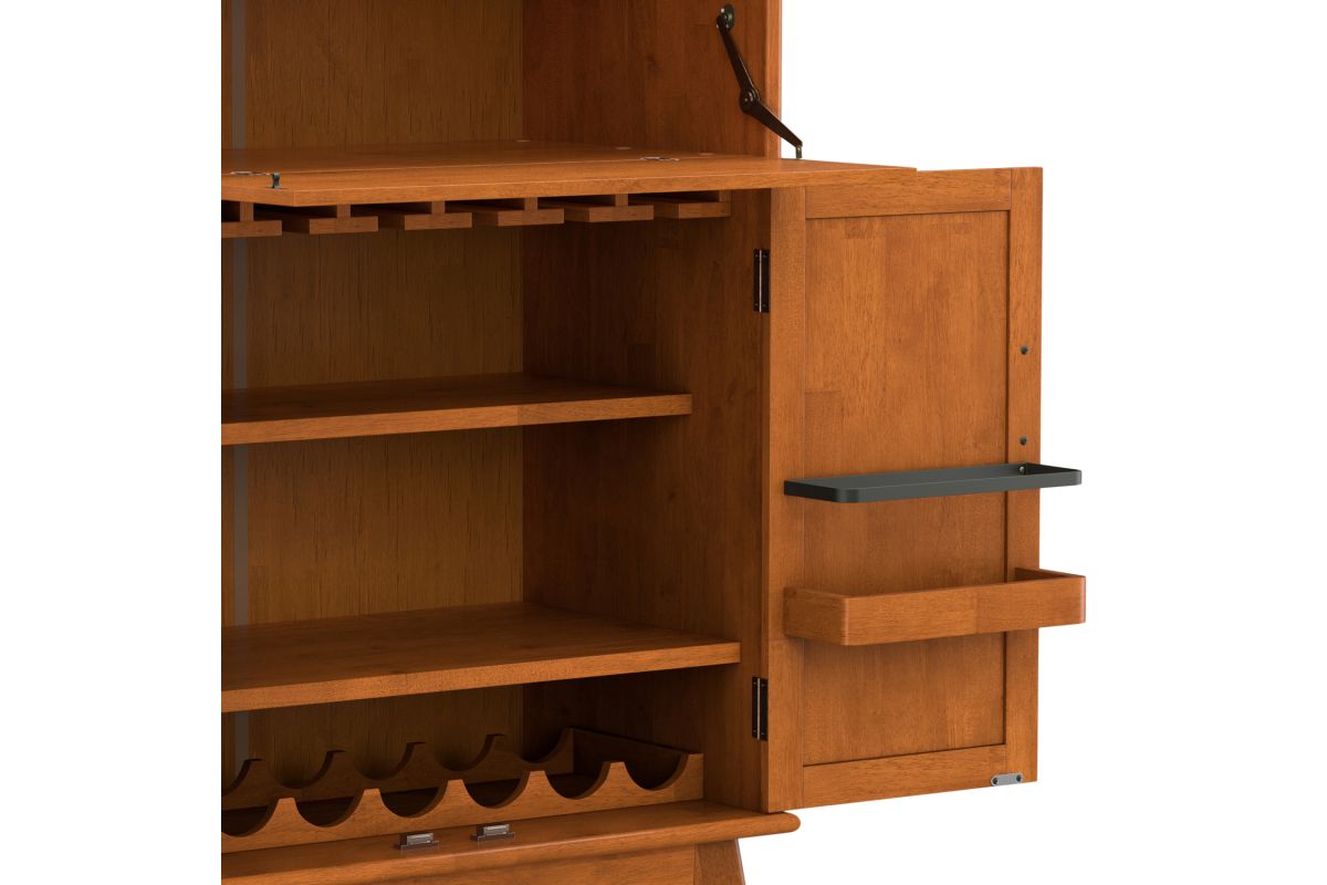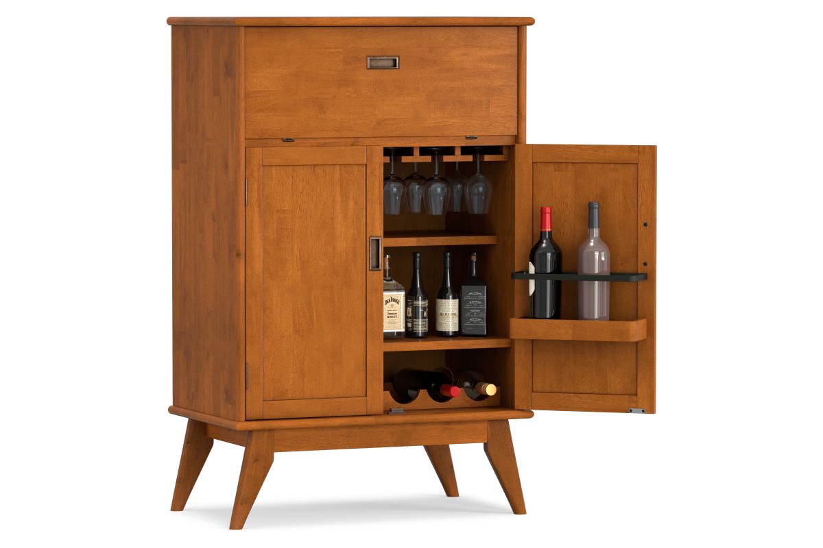 Let us introduce you to the Draper Bar Cabinet. Made of solid rubber wood, the bar cabinet offers storage as well as prep space, with a drop-down door that doubles as a work surface for crafting cocktails. Also behind closed doors are a stemware rack, wine bottle shelf and additional shelves for spirits, glassware and bar accessories. Finished with recessed brass hardware, this mid-century modern bar cabinet is ready to add some flair to your living space. Assembly required.