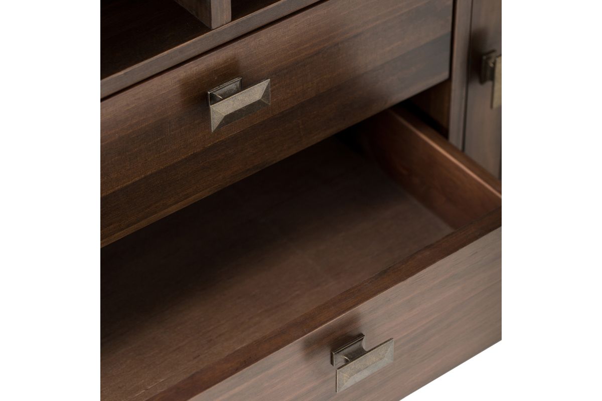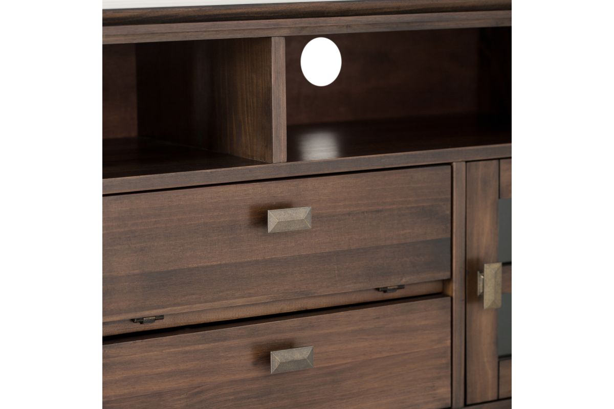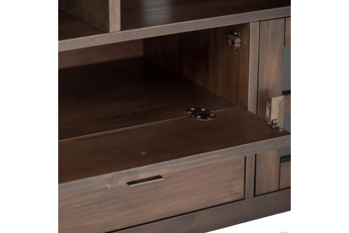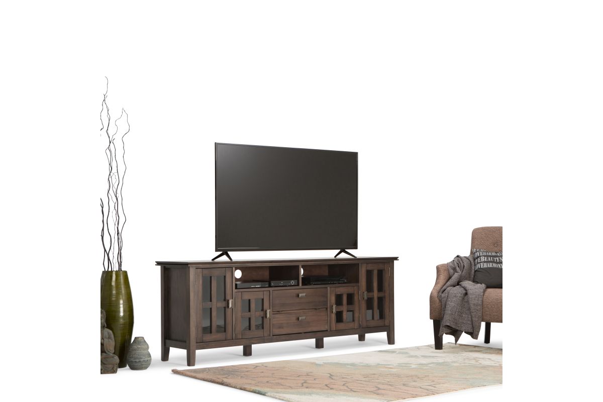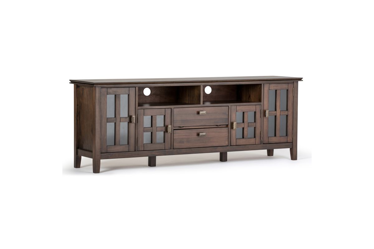 Now that 80 inch flat screen TVs are more affordable, you need to have one. To enjoy it fully, you will also need the perfect TV Stand to position your TV just right. Look no further. The Artisan Extra Wide TV Stand is perfectly sized for TVs up to 80 inches. It has plenty of storage space for all your media and gaming devices. It has a large centrally located open area with two drawers as well as two enclosed spaces. The two large side storage cabinets open to one adjustable shelf each. The unit features cord management cut-outs for easy installation of TV and media components. Assembly required.