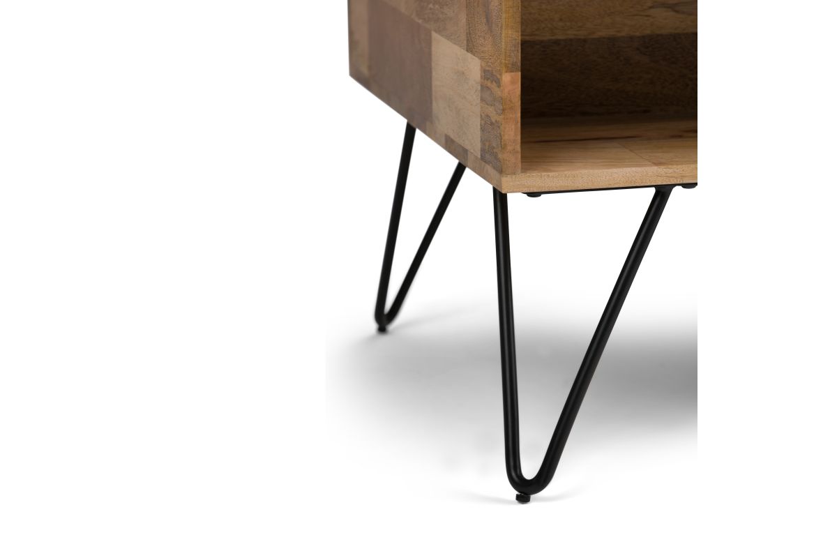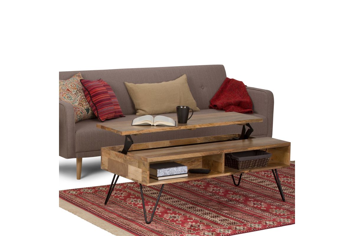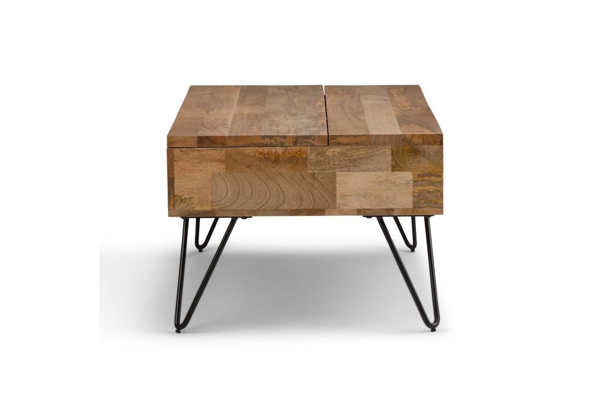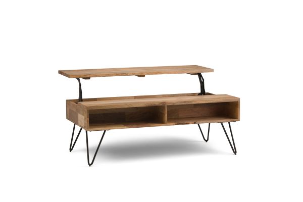 Style and convenience are at work in this uniquely functional Hunter Lift-Top Coffee Table. The top lifts up to reveal hidden storage, pulling toward you for the perfect surface to type on your laptop or eat in front of the television. The table features two open compartments for stacking books or displaying decorative objects. Black iron hairpin legs along with Solid Wood add an industrial component. Assembly required.