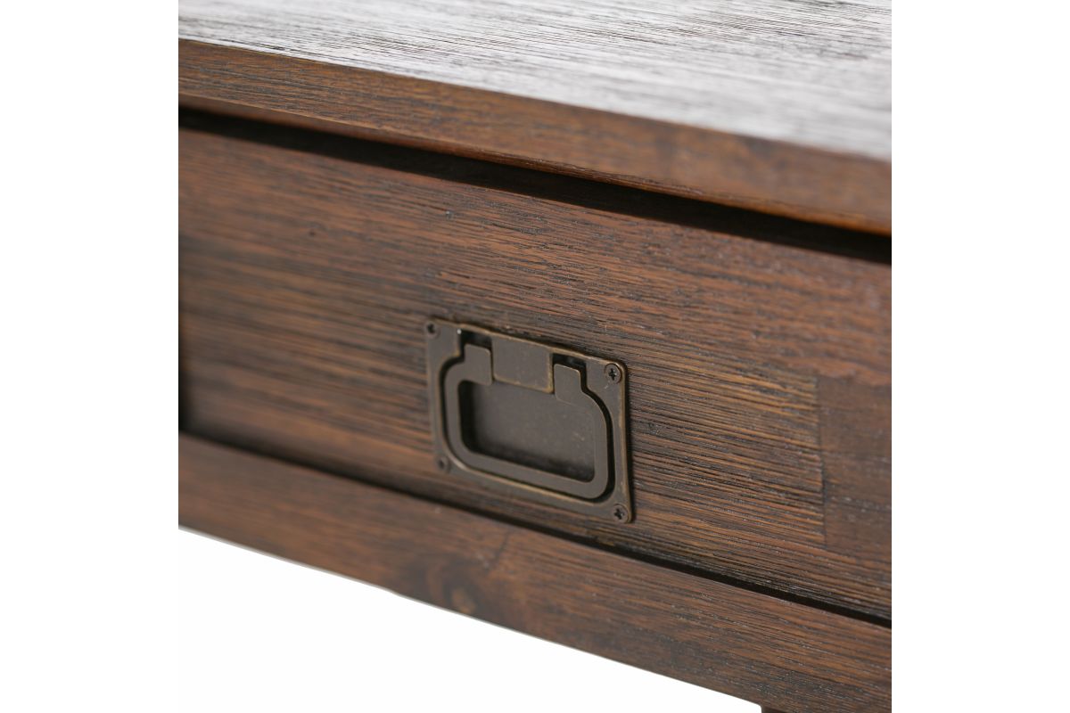 - Rustic design includes folding drawer pulls in an Antique Brass hardware finish