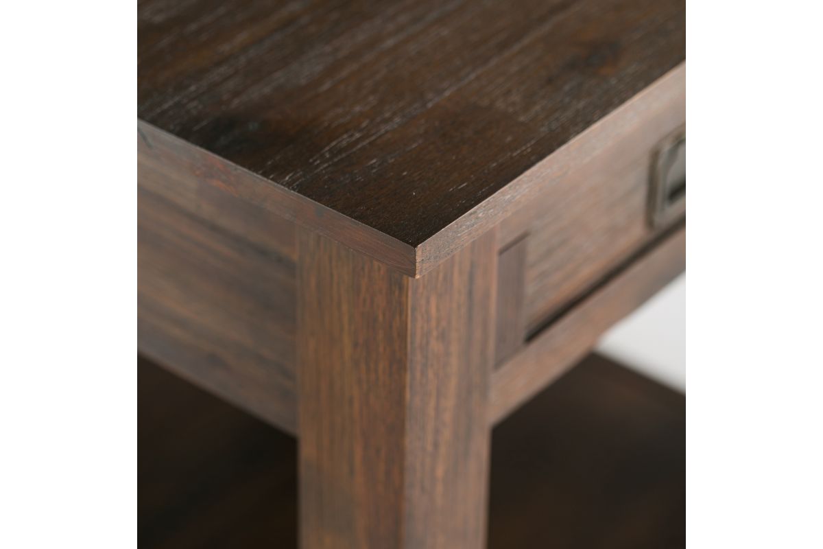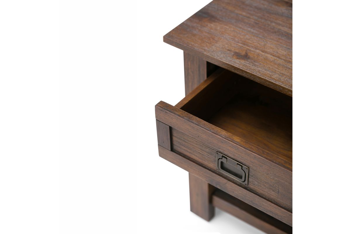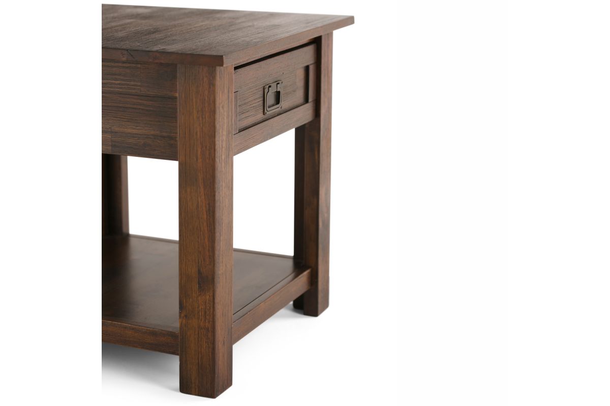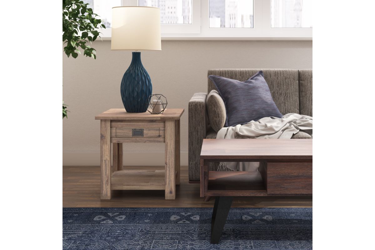 Pair your sofa, accent chair or bed with the rustic contemporary Monroe End/Side Table. It features a single drawer and open bottom, perfect for storing and displaying treasured mementos. This striking End Table is made from beautiful and distinct solid Acacia. With its clean lines, shaker style paneling and Antique Brass pulls, the Monroe End/Side Table will enhance your room decor. Assembly required.