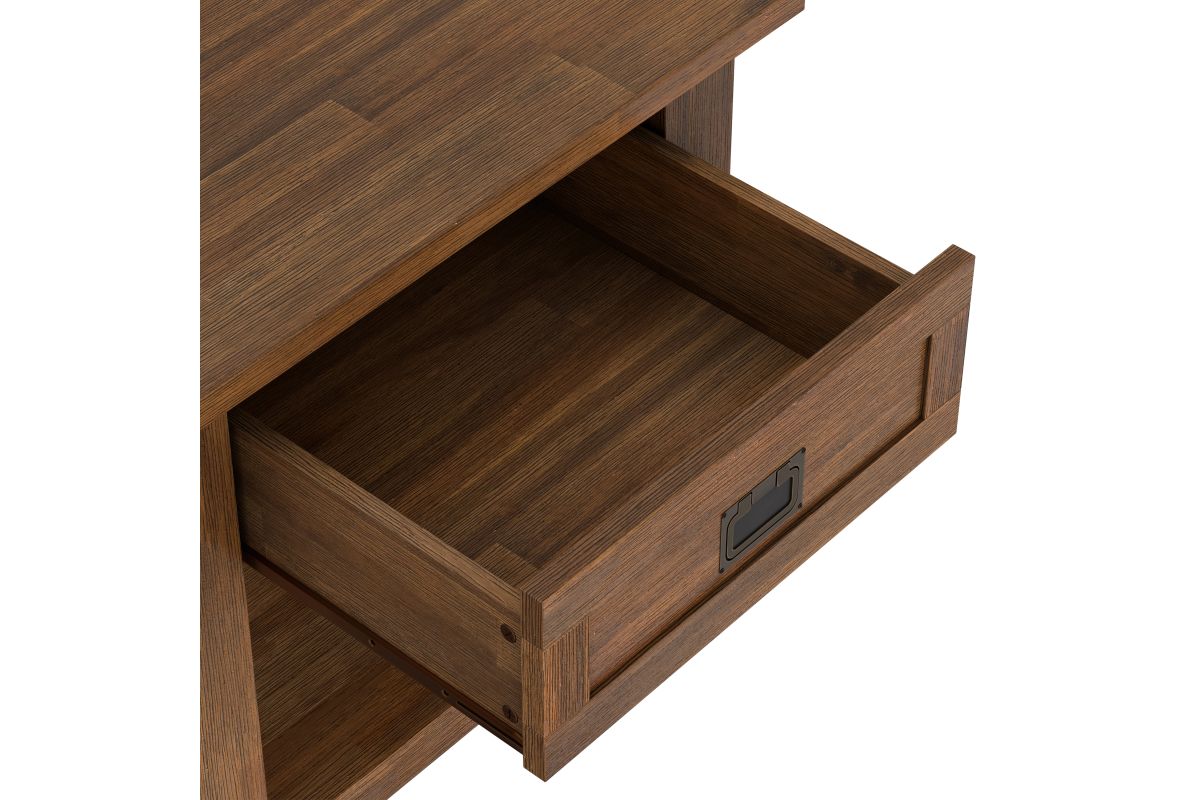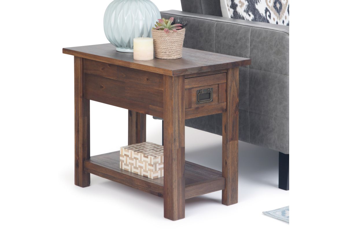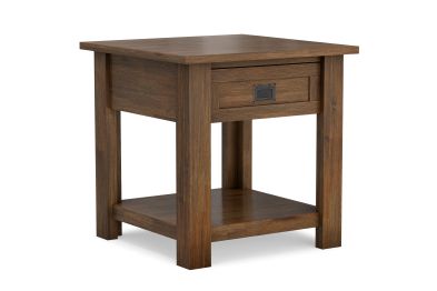Pair your sofa, accent chair or bed with the rustic contemporary Monroe End/Side Table. It features a single drawer and open bottom, perfect for storing and displaying treasured mementos. This striking End Table is made from beautiful and distinct solid Acacia. With its clean lines, shaker style paneling and Antique Brass pulls, the Monroe End/Side Table will enhance your room decor. Assembly required.
