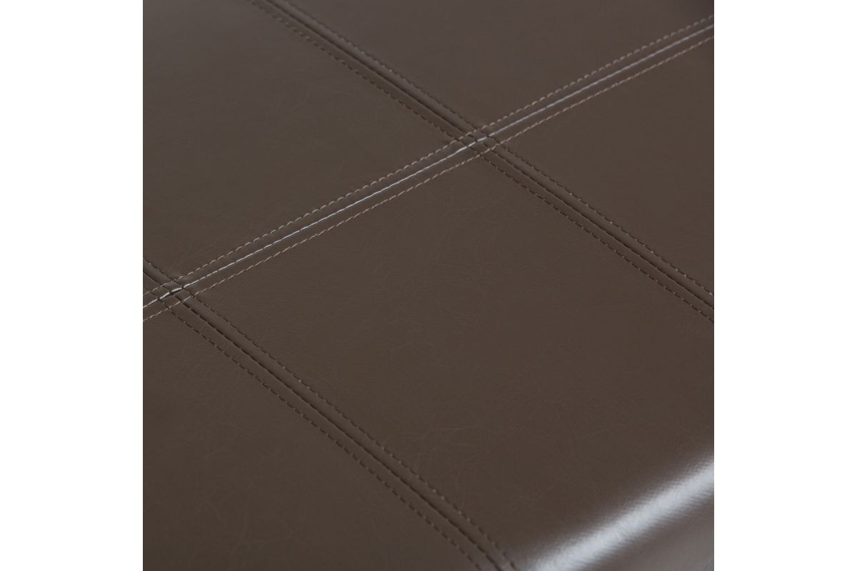 - Upholstered with a durable Chocolate Brown Vegan Faux Leather