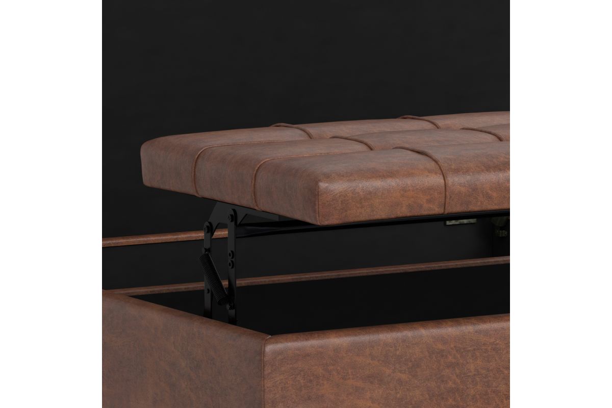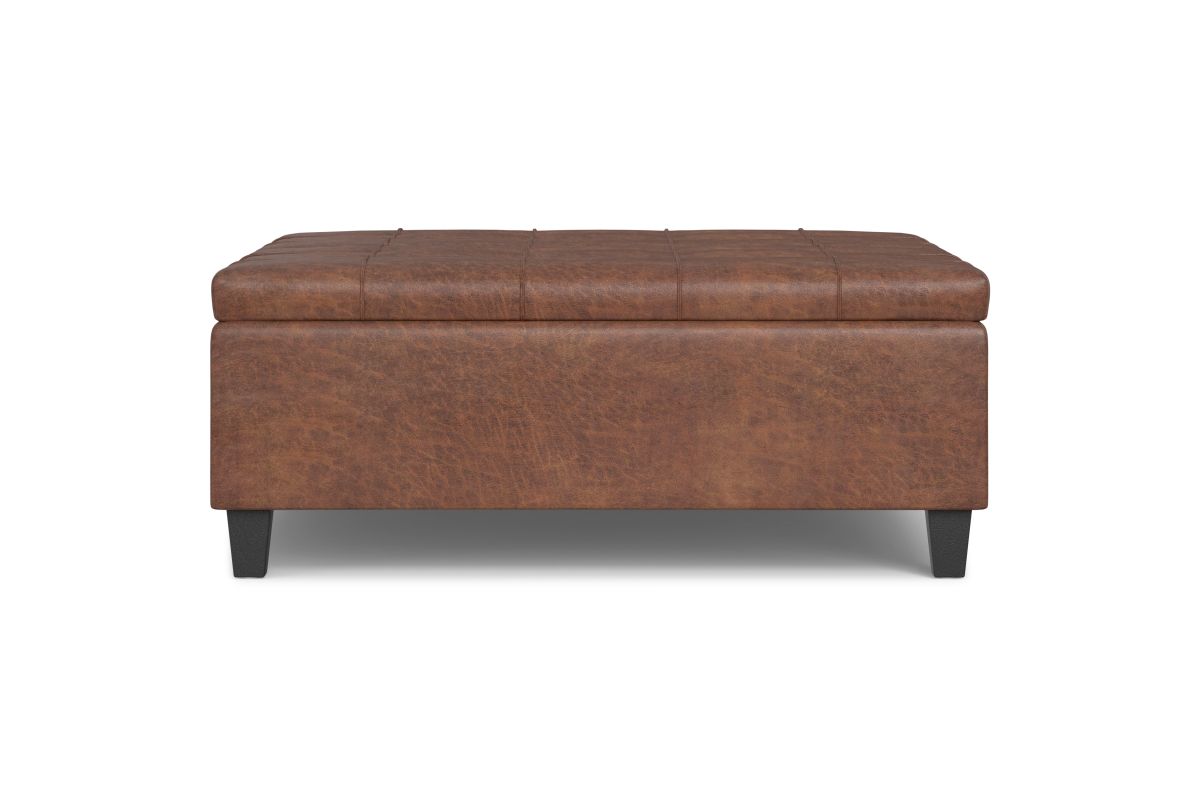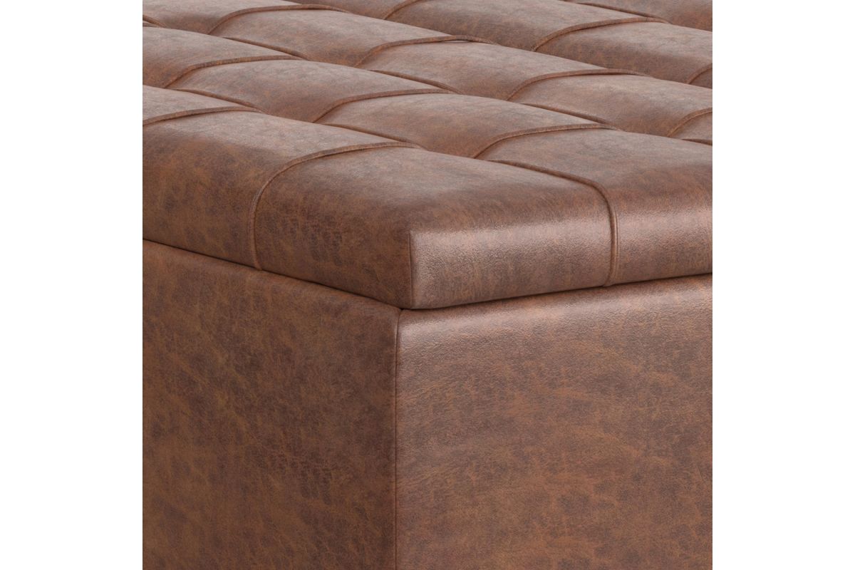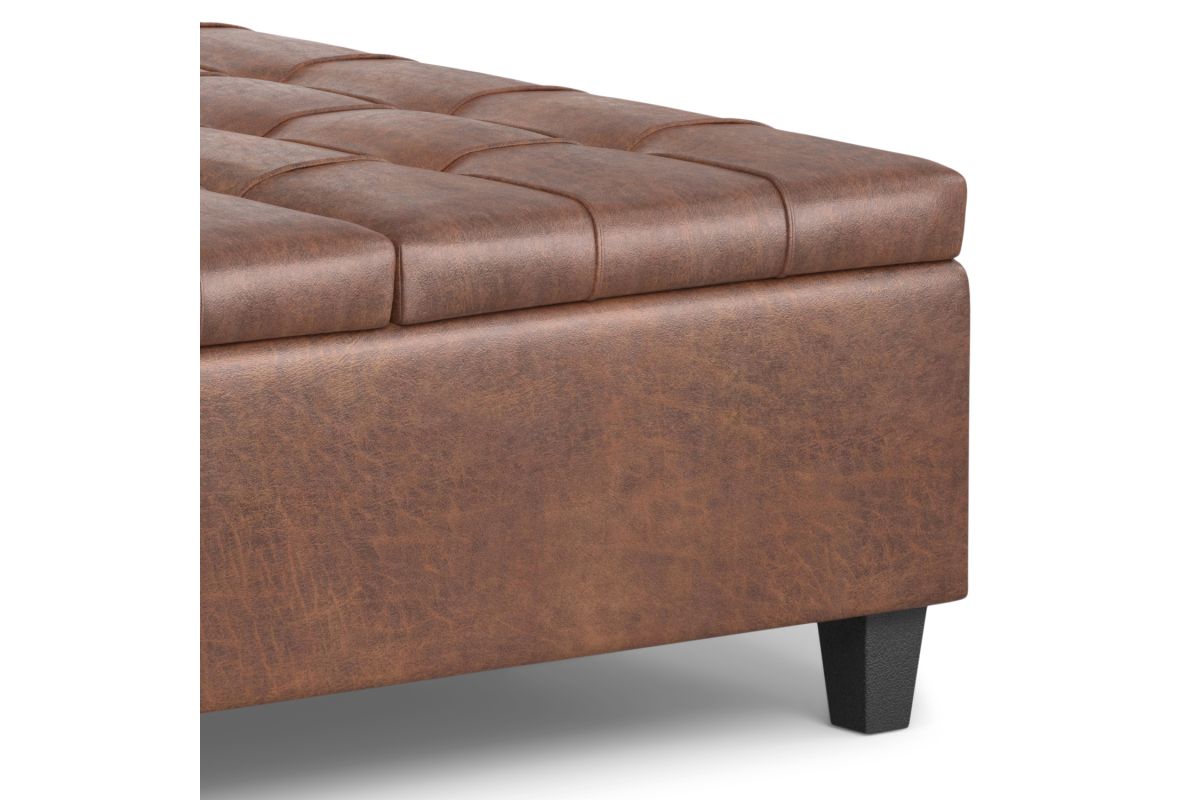 - Upholstered with a durable Distressed Saddle Brown Vegan Faux Leather