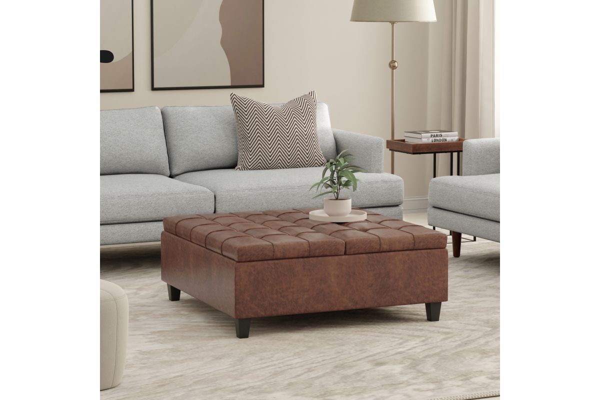 Maximize the space in your living room or family room with the Harrison Large Square Coffee Table Storage Ottoman. The contemporary, yet functional design of the ottoman makes it a necessity for any home. The split top features stylish tufted details and one side lifts up - perfect for a laptop, tablet, or dining. The large interior space is the perfect solution for your storage needs. The Harrison Large Square Coffee Table Storage Ottoman is available in a variety of colors and upholstered options. Assembly required.