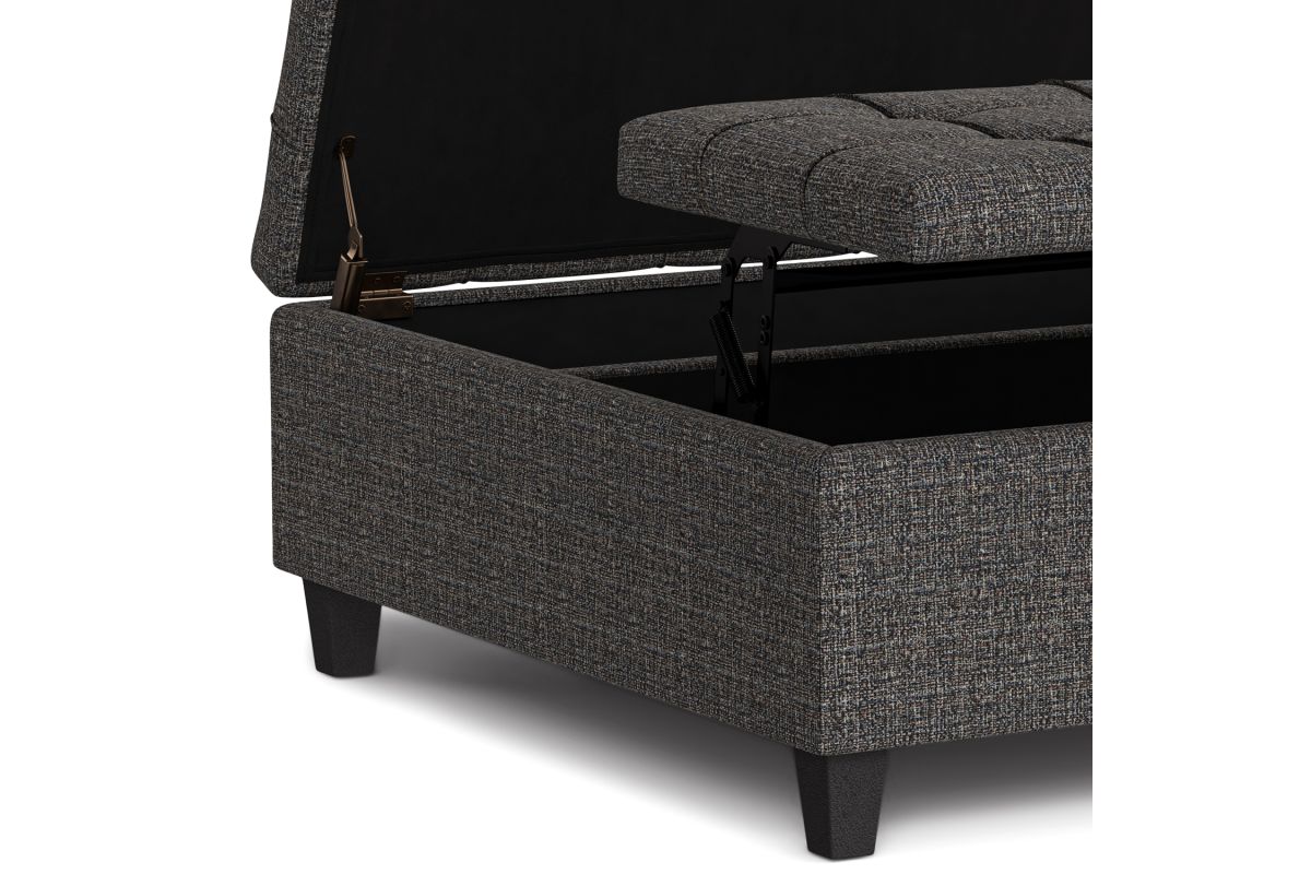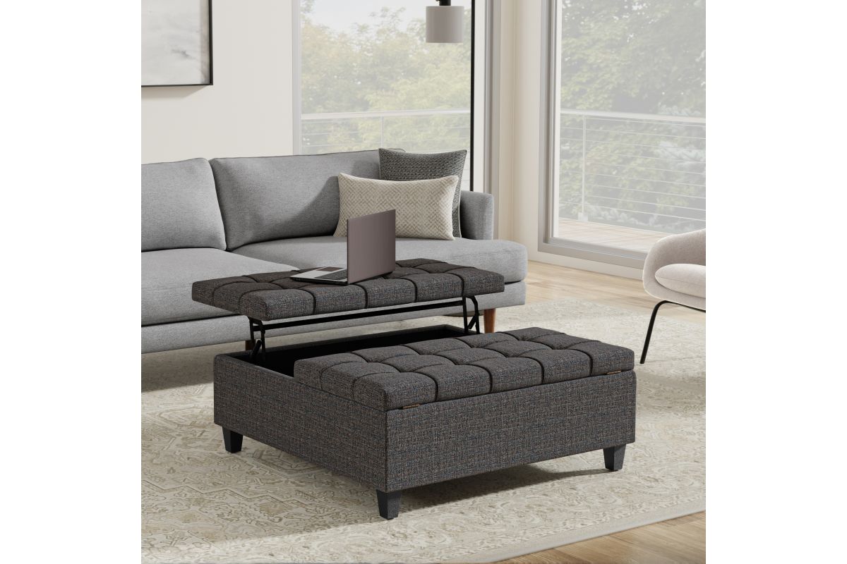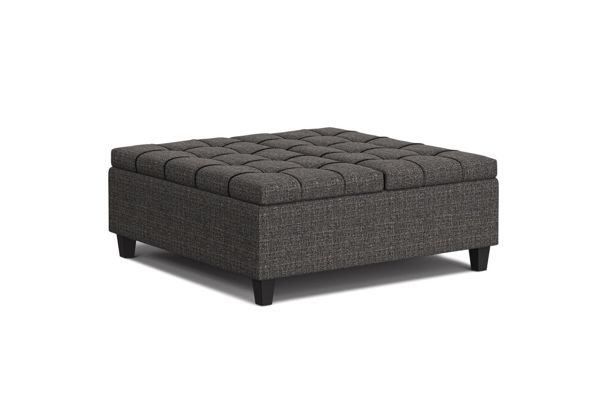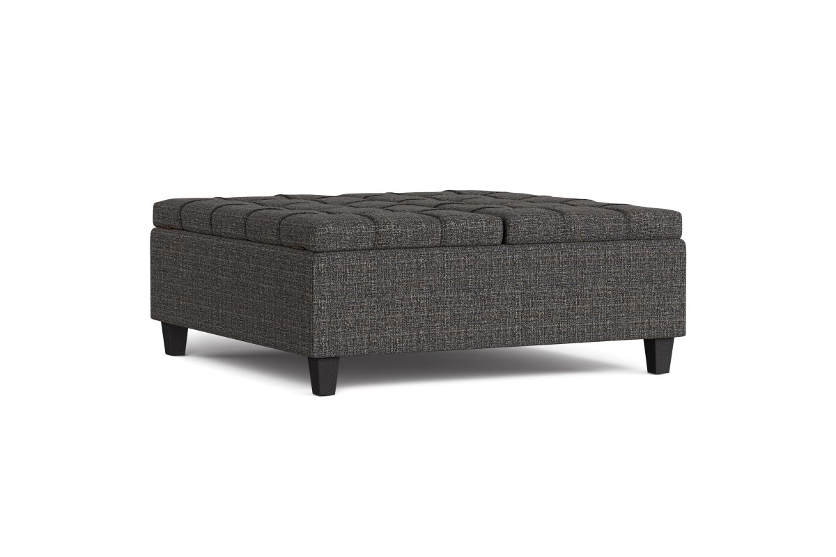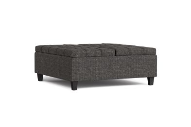 Maximize the space in your living room or family room with the Harrison Large Square Coffee Table Storage Ottoman. The transitional, functional design of this ottoman makes it a necessity for any home. The split top with tufted detailing has one side that lifts up and another side that you can raise and pull toward you to use as a surface for a laptop or food and beverages. Two storage compartments provide ample space for games, puzzles, books, and more. The Harrison Large Square Coffee Table Storage Ottoman is available in a variety of colors and fabric options. Assembly required.