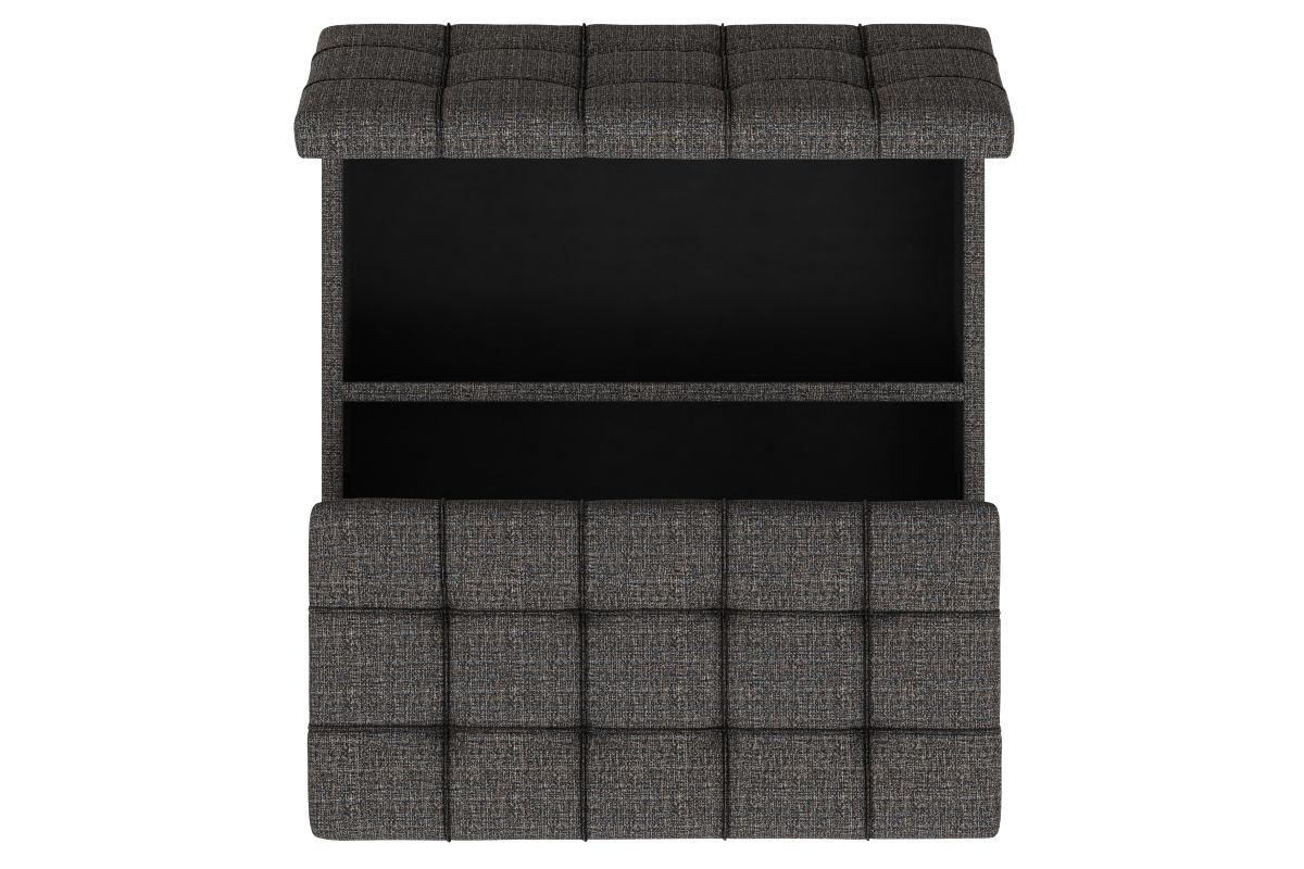 - Upholstered in a durable Ebony tweed-look fabric with stitched tufting detail.