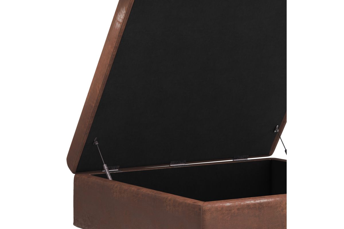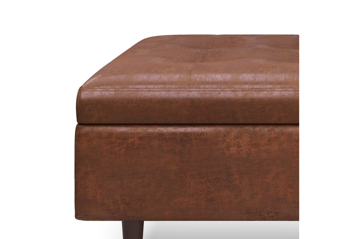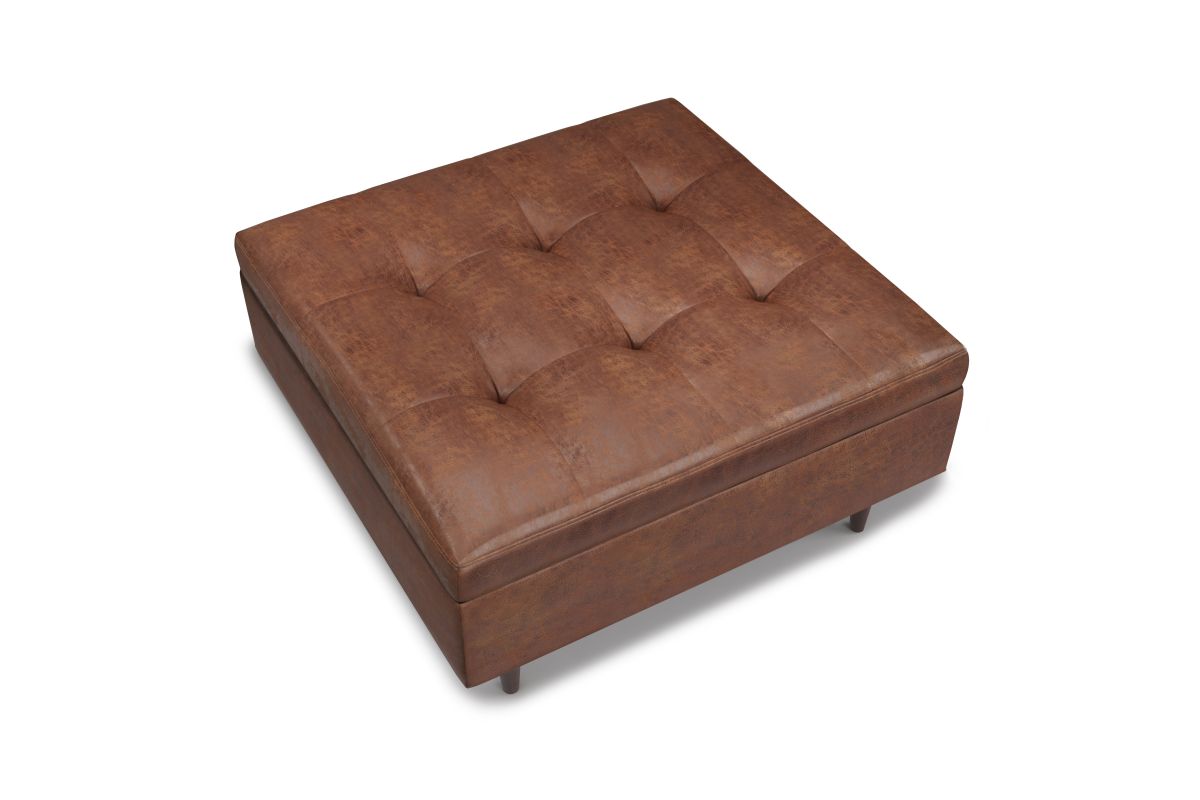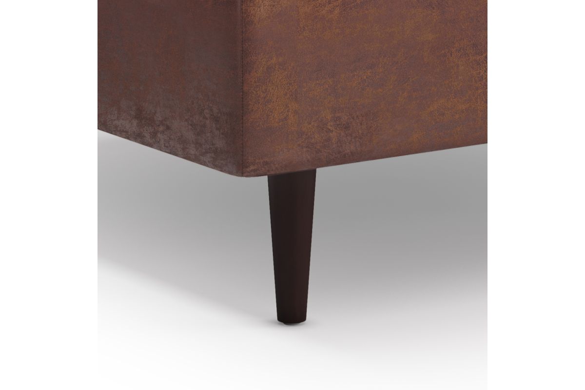 - Upholstered with a durable Distressed Saddle Brown Vegan Faux Leather