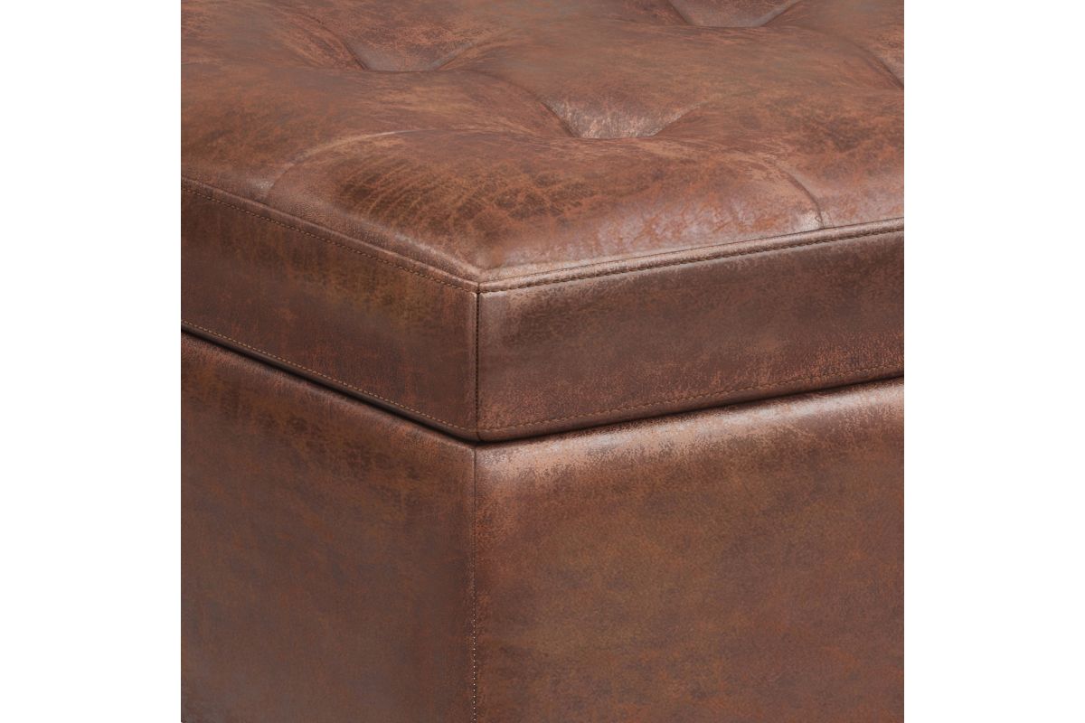 - Upholstered with a durable Distressed Saddle Brown Vegan Faux Leather