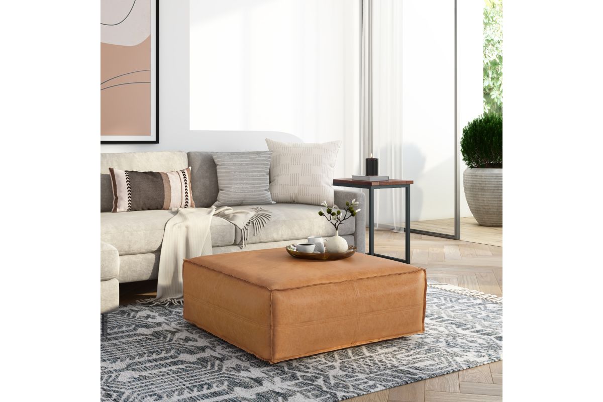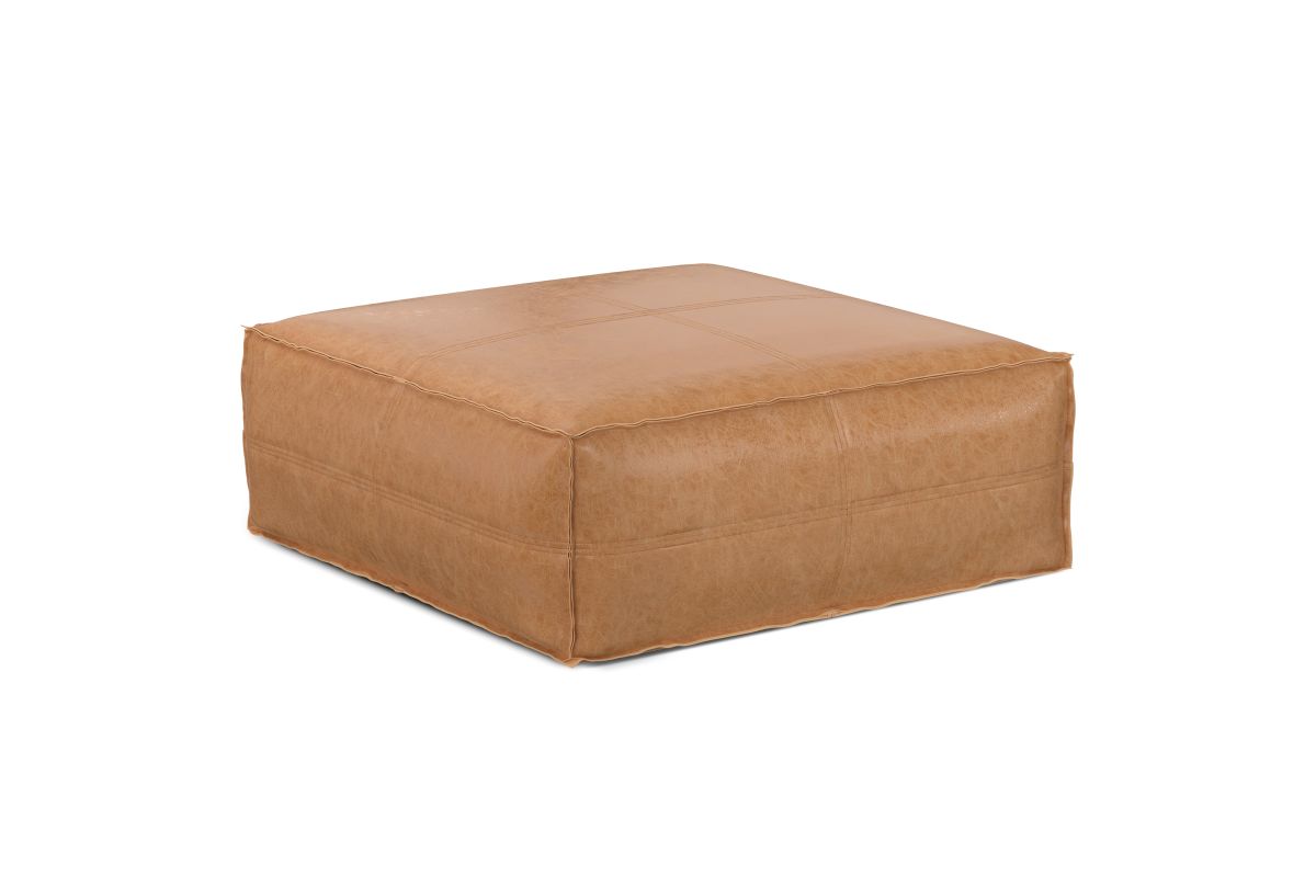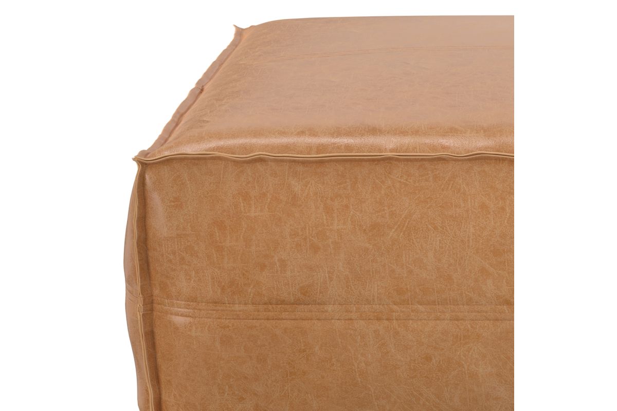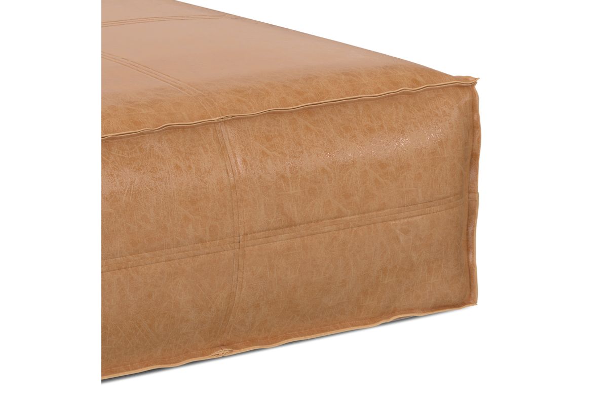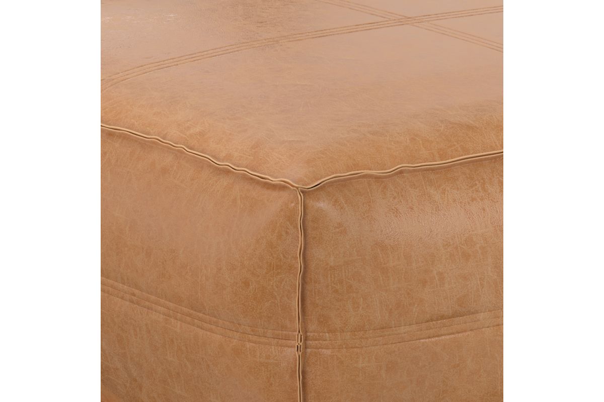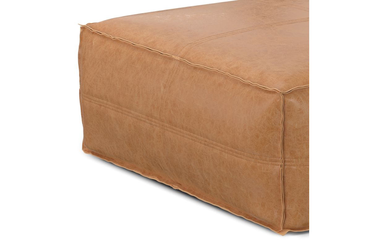 Crafted for both style and function, the Brody Extra Large Coffee Table Pouf brings a bold yet inviting presence to your living space. Upholstered in distressed faux leather, this oversized square pouf exudes a vintage-inspired charm, reminiscent of well-loved heirloom pieces. The supple faux leather is reinforced with intricate stitching details for added durability, while the interior is filled with high-density polystyrene EPS beads, ensuring long-lasting support and shape retention. Whether used as a coffee table, ottoman, or casual floor seating, this versatile piece fits seamlessly in modern, rustic, and bohemian-inspired interiors. Its generous 36-inch square design makes it a statement-making focal point, perfect for gatherings or quiet moments with a book. No assembly required.