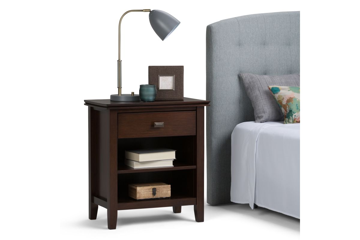 Good things really do come in small packages. Nothing could illustrate this better than the design of our Artisan Bedside End Table which features one drawer and an open storage area with one shelf. The table is sized perfectly to allow room for a table lamp, book and family photos. This flexible piece can be used as a bedside table, side table, or end table. Assembly required.