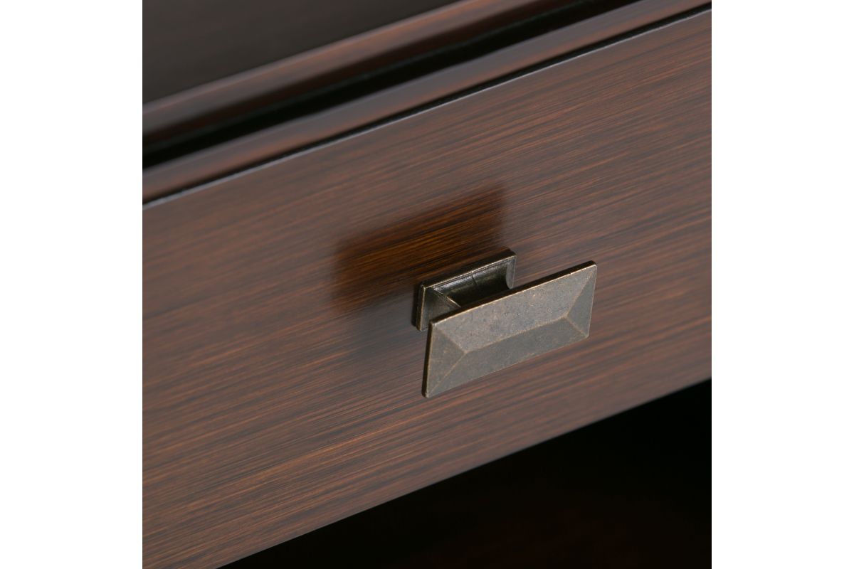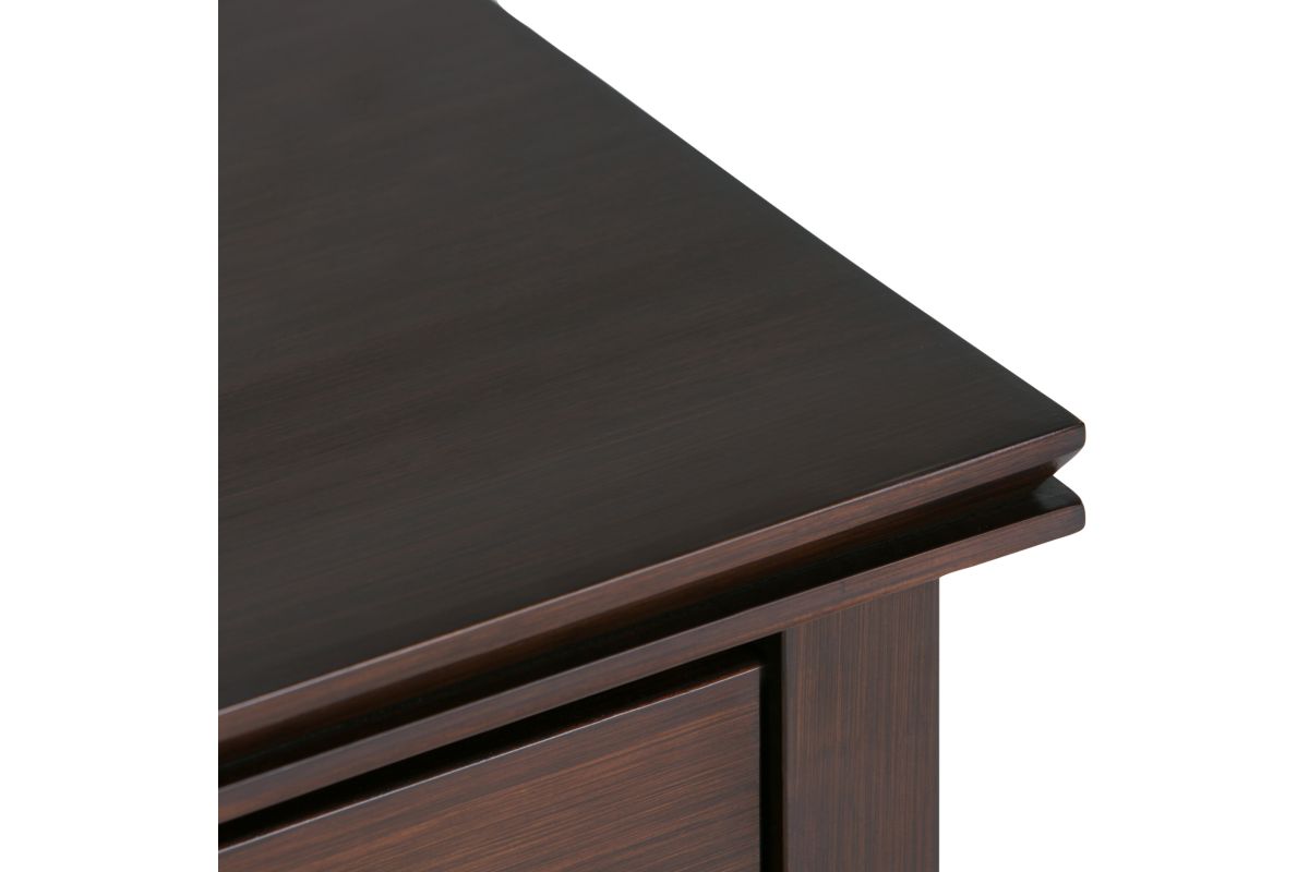 - Transitional design includes clean angle-edged tabletop, square, slightly tapered legs, and rectangular antique bronze knobs