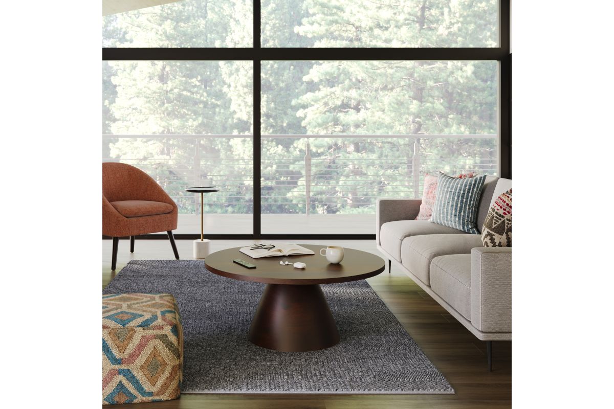 Give your living room a modern focal point with the Winnie Round Coffee Table. This round coffee table boasts a rich walnut finish on the solid wood top and pedestal base to create a stunning contemporary look. With its simple design, this coffee table provides a sophisticated addition to elevating your living space. No assembly required.