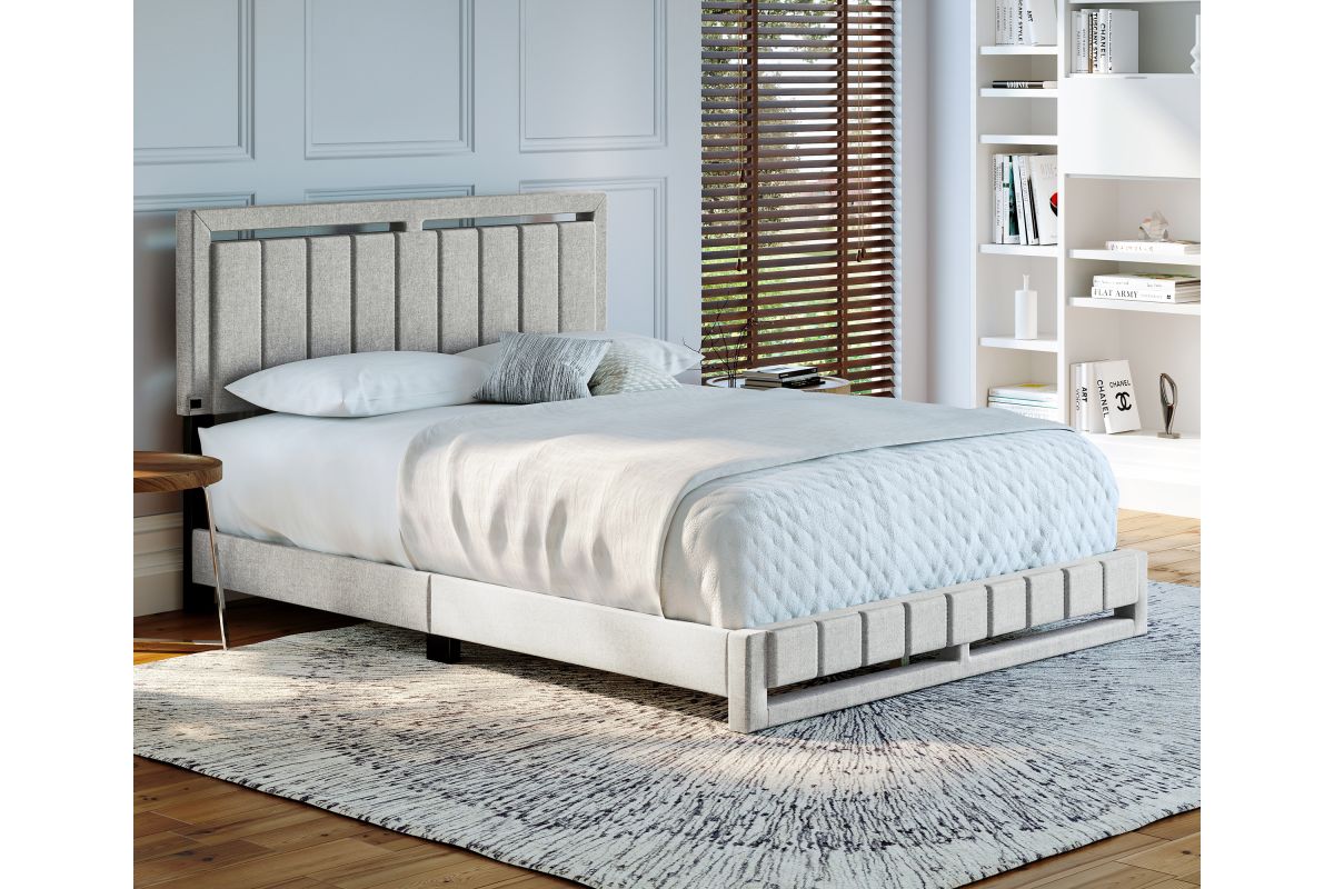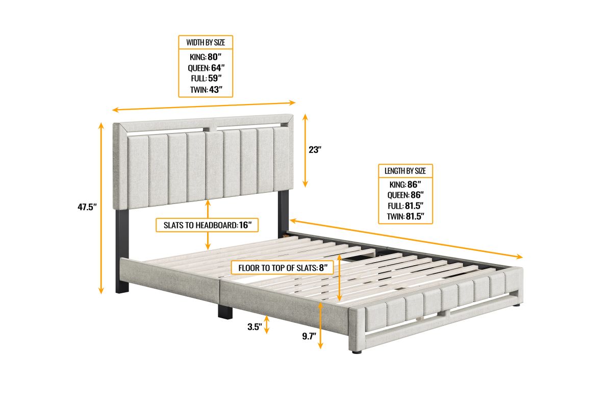 This stately upholstered platform bed frame features vertical channel tufting on the headboard with matching footboard that extends to the floor for a unique, polished focal piece for any bedroom. Frame is wrapped and slightly padded for a premium look and feel. Bed comes with a full 14-slat system that will support up to 700 lbs. No box spring or foundation required. Ships in 1 box for easy transport. Assembles in under 15 minutes, and all hardware is conveniently zipped up behind the headboard. 1 Year Limited Warranty.