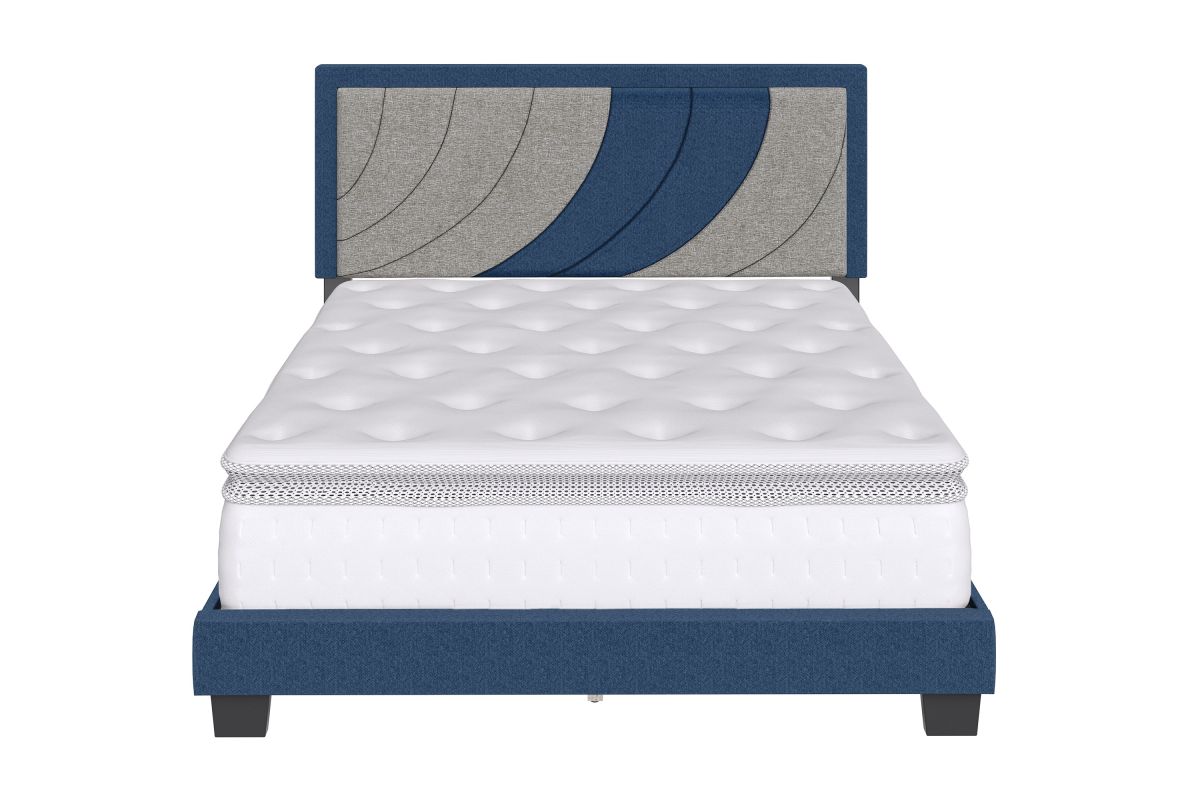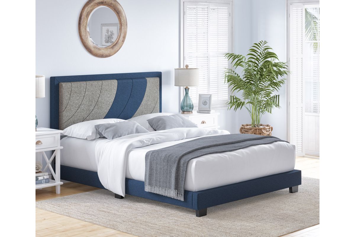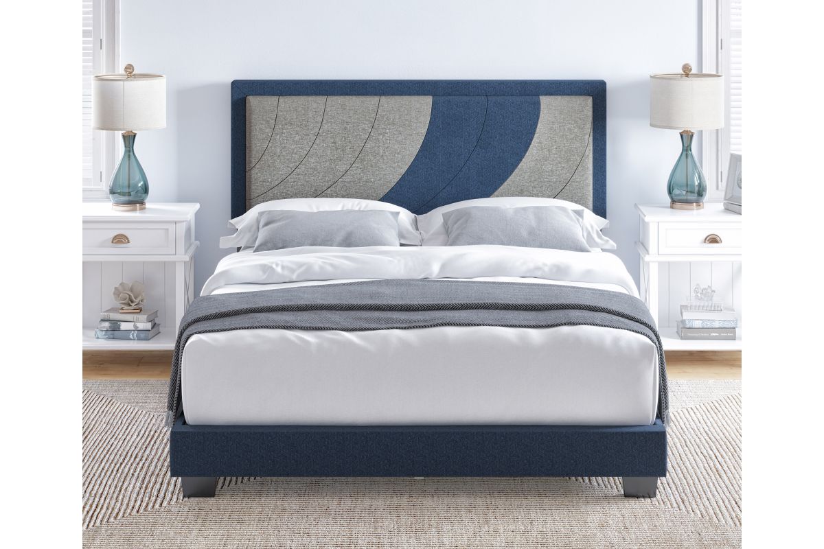 Sail away on this nautical-themed two-toned upholstered platform bed. The headboard features a bold color blocked design of an upward-moving wave to inspire only the best dreams. The headboard is framed in a contrast color, along with the sides and foot of the bed for a uniform, pulled-together look. Frame is fully wrapped and slightly padded for a premium look and feel. Bed comes with a full 14-slat system that will support up to 700 lbs. No box spring or foundation required. Ships in 1 box for easy transport. Assembles in under 15 minutes, and all hardware is conveniently zipped up behind the headboard. 1 Year Limited Warranty.