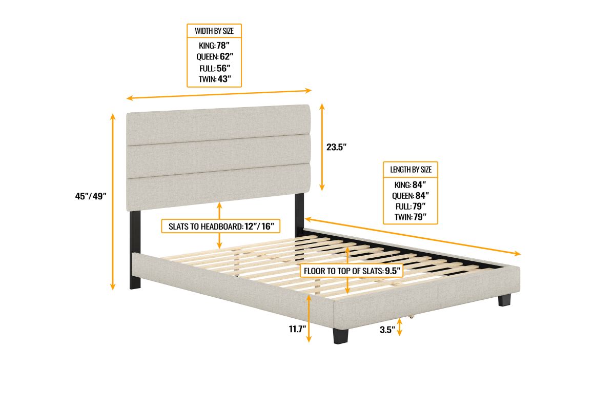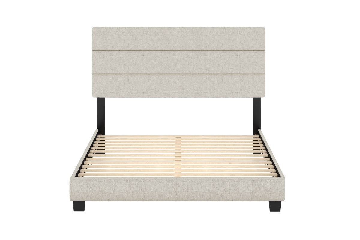 Clean, modern lines define this upholstered platform bed, making it the showpiece in any setting. The horizontal lines of the tri-panel headboard create a linear design concept you can easily accentuate with your favorite decor. Manufactured with high quality materials, the entire bed is upholstered and slightly padded for a premium look and feel.