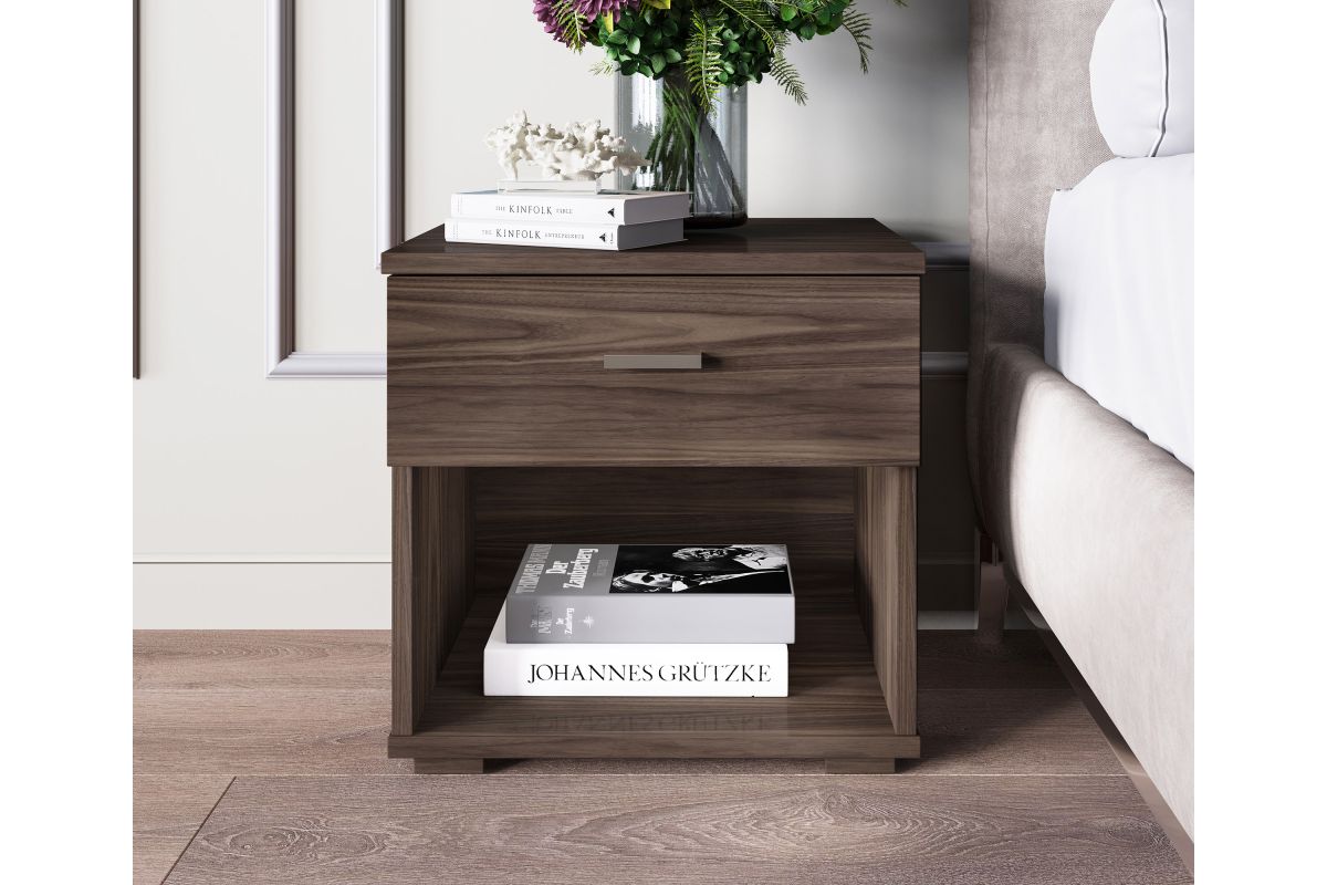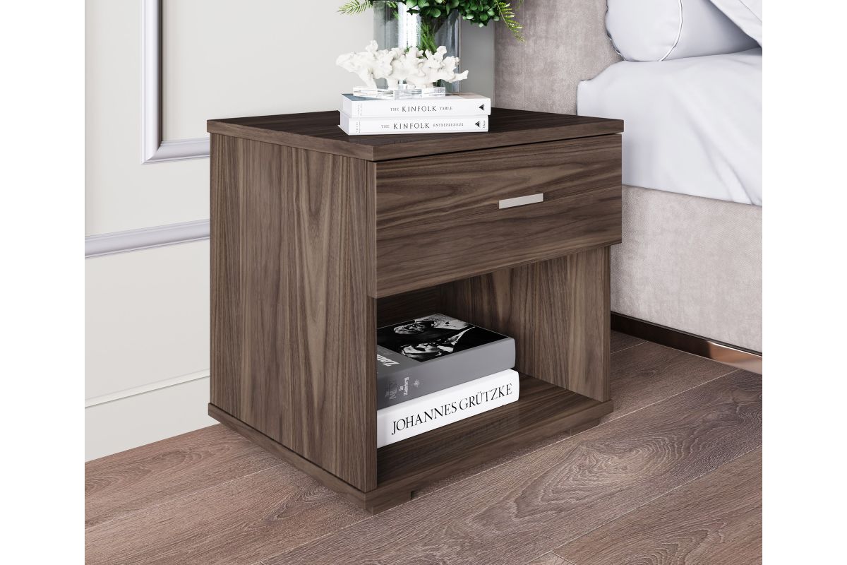 The Emilia Classic One Drawer Nightstand is an easy way to add extra functionality to your bedroom. This simple bedside table has a single drawer, a large open storage cubby, and a spacious tabletop to hold your nighttime essentials. The Euro-glide drawer keeps small items out of sight; store bulky items like books or extra blankets in the open space below. The Emilia Single drawer bed table also adds classic style to your space with wood grain laminate finishes and sleek silver drawer pull. This durable hardwood PDF piece is available in Black, White, Walnut, or Cherry wood-look finishes. Ships flat in 1 box and assembles in 30 minutes or less. Philips screwdriver required. Assembly is required.