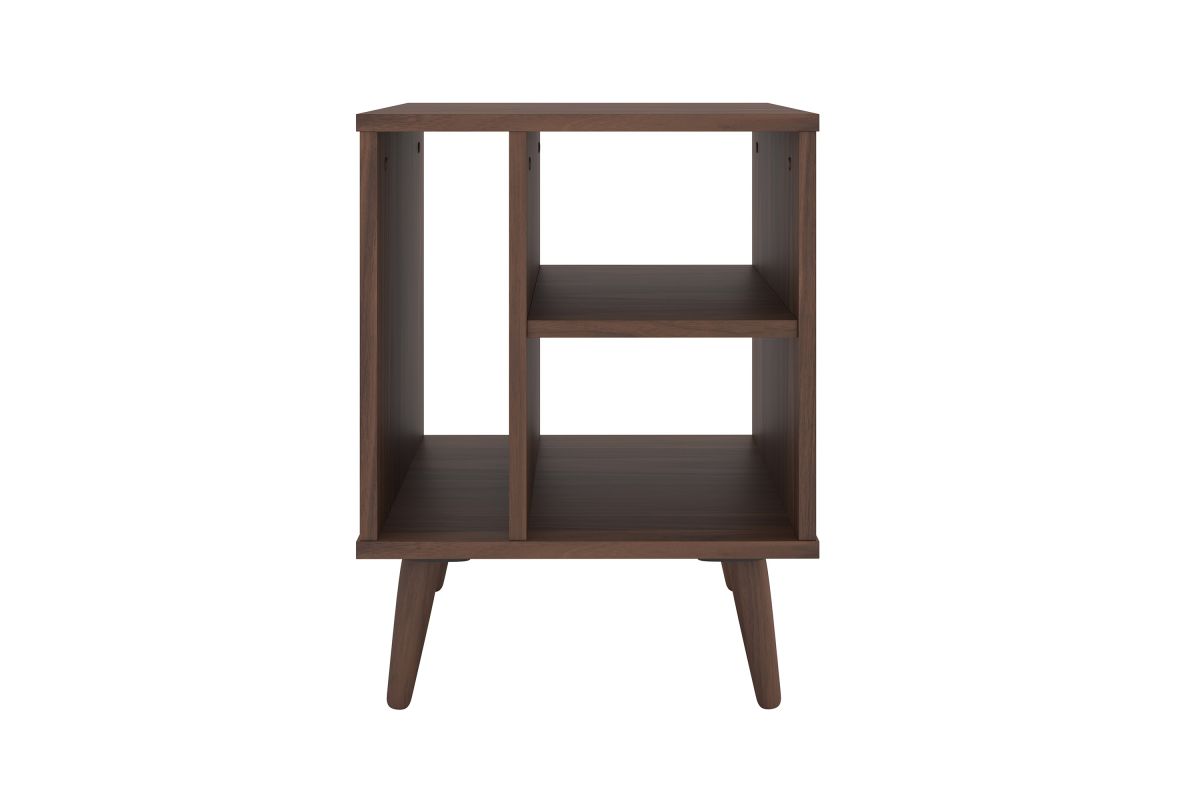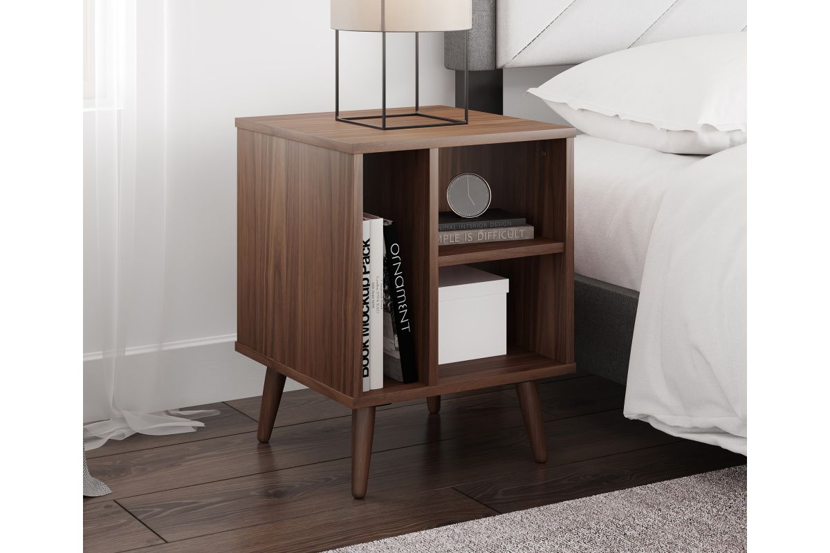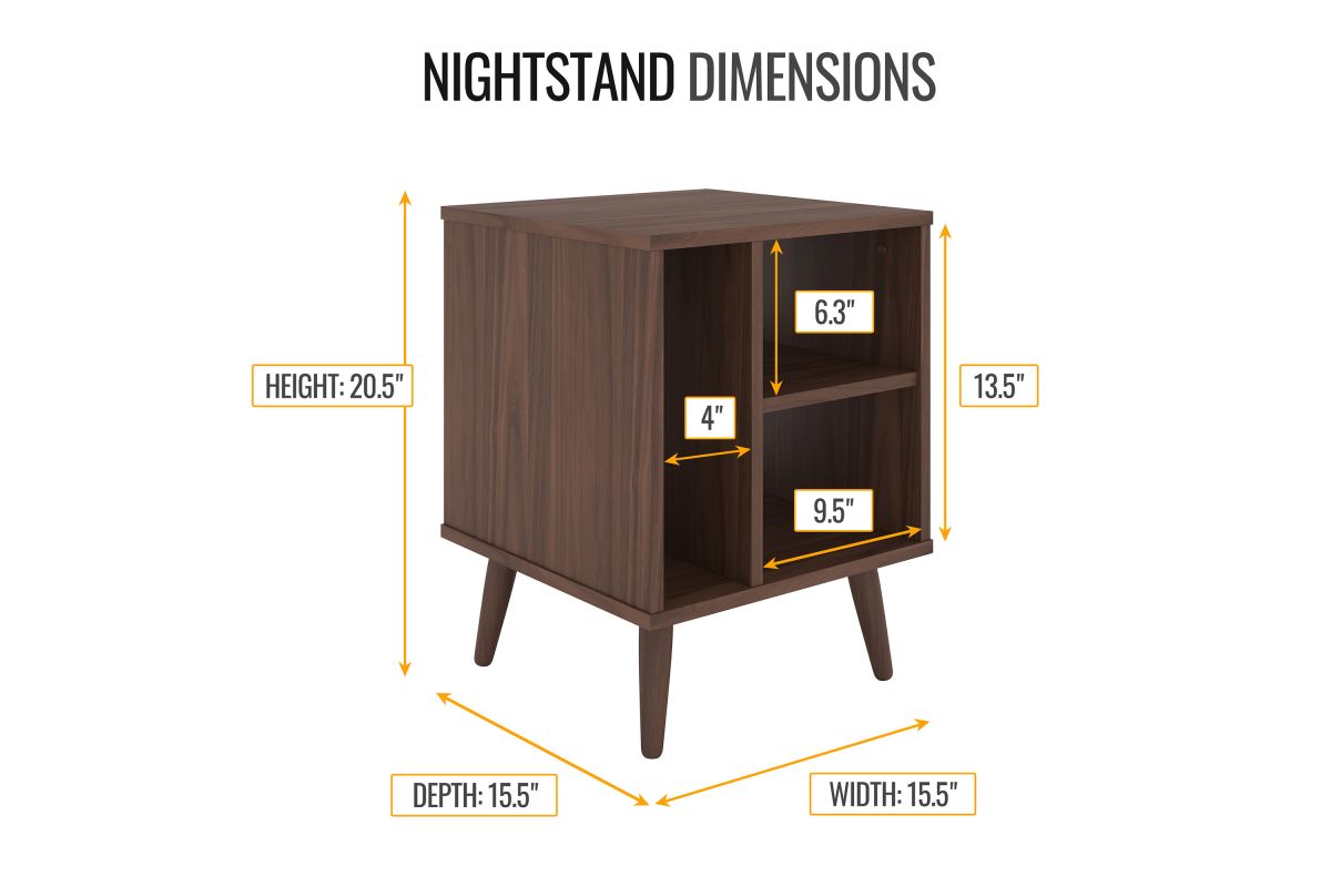 For a furniture piece as unique as your style, the Winston Mid-Century Modern Nightstand is the perfect fit. This retro end table features three open storage cubbies to keep your bedside essentials organized. Keep your phone or journal on the upper shelf, while the tall narrow section is perfect for vinyl records or books. The Winston Mid-Century Modern Nightstand features solid wood tapered legs that add retro style; a laminated MDF upper keeps your table easy to clean. At just over 20 inches high, this wooden night table pairs perfectly with lower profile platform beds. Winston's effortless midcentury modern profile can add flair to your living room or home office, too, thanks to four different attractive wood-grain finishes. Keep your essentials at hand and in vintage style with the Winston Mid-Century Modern Nightstand. Ships to your door in a single box and assembles in 15 minutes (2 adults recommended). Assembly is required.