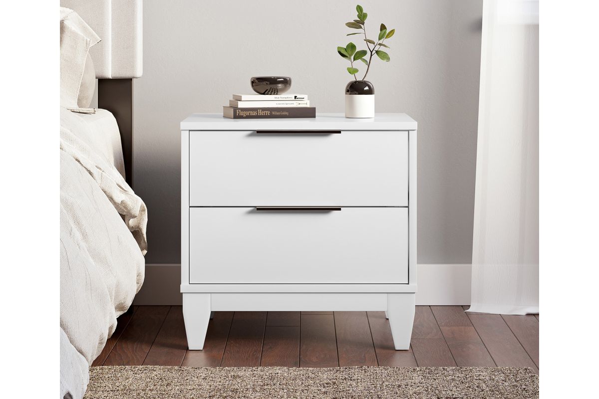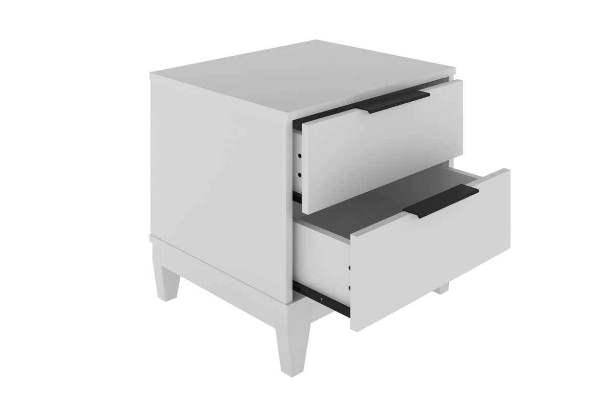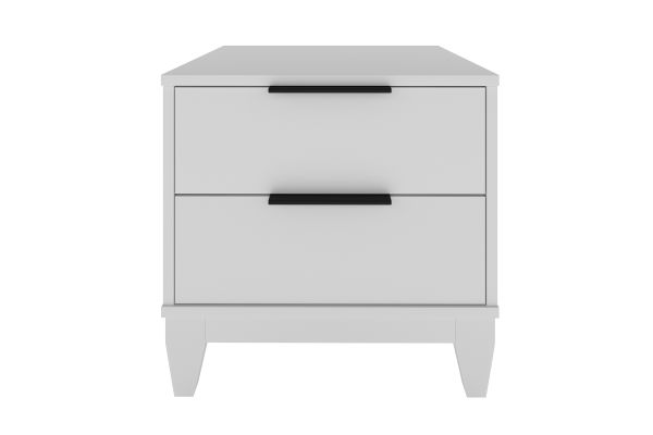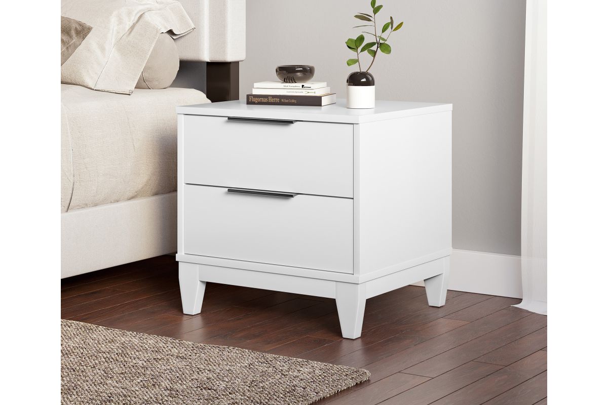 Keep the essentials at hand and out-of-sight with the Mesa Traditional Two-Drawer Nightstand. This end table brings timeless farmhouse style to your bedroom; durable MDF construction is laminated in a wood-grain finish, so you can enjoy the perfect balance of style and durability. This 2-drawer wooden bedside table also features thoughtful details like solid wood block tapered legs and sleek black metal drawer pulls. Mesa's double drawers give you extra storage space for your glasses, reading, and the TV remote; euro-glides keep things quiet and smooth. It's a multipurpose storage solution for bedrooms, home offices, and even college dorms. The Mesa Traditional double drawer nightstand is sturdy and built to last from high-quality composite wood. Assembly takes just 15 minutes, with all tools and instructions included (2 adults recommended for assembly). Each Nightstand ships straight to your door in one convenient box. Assembly is required.