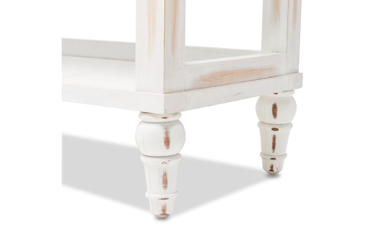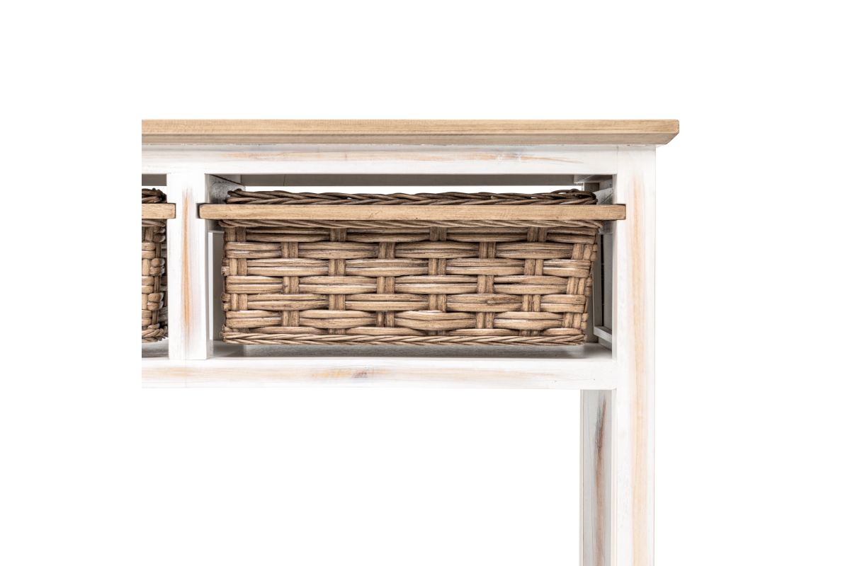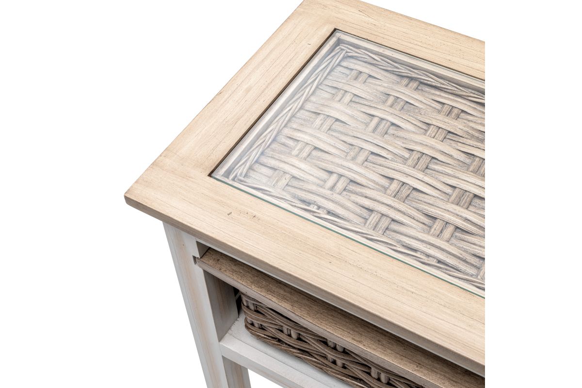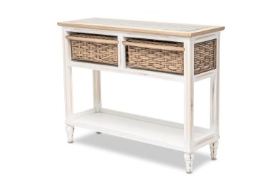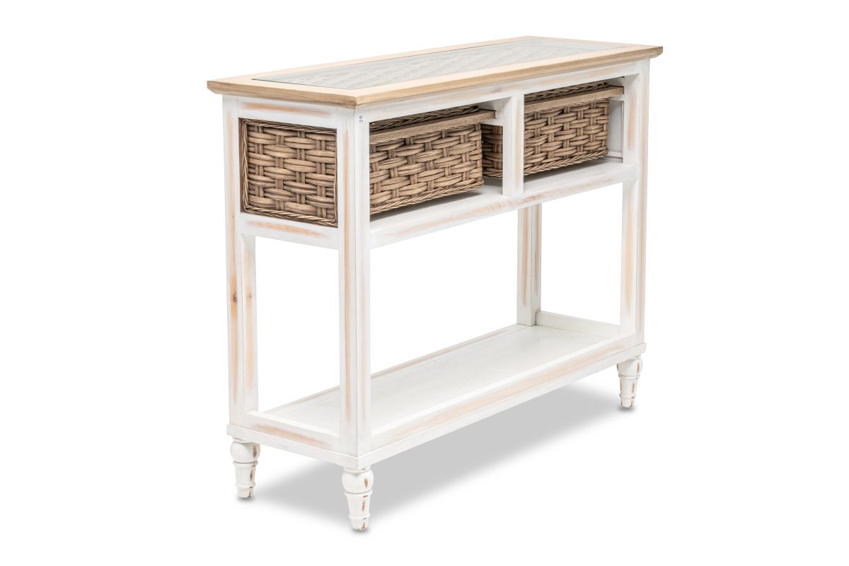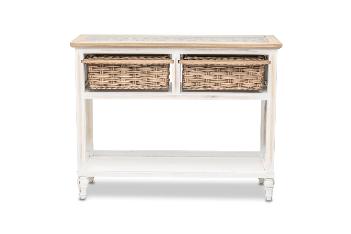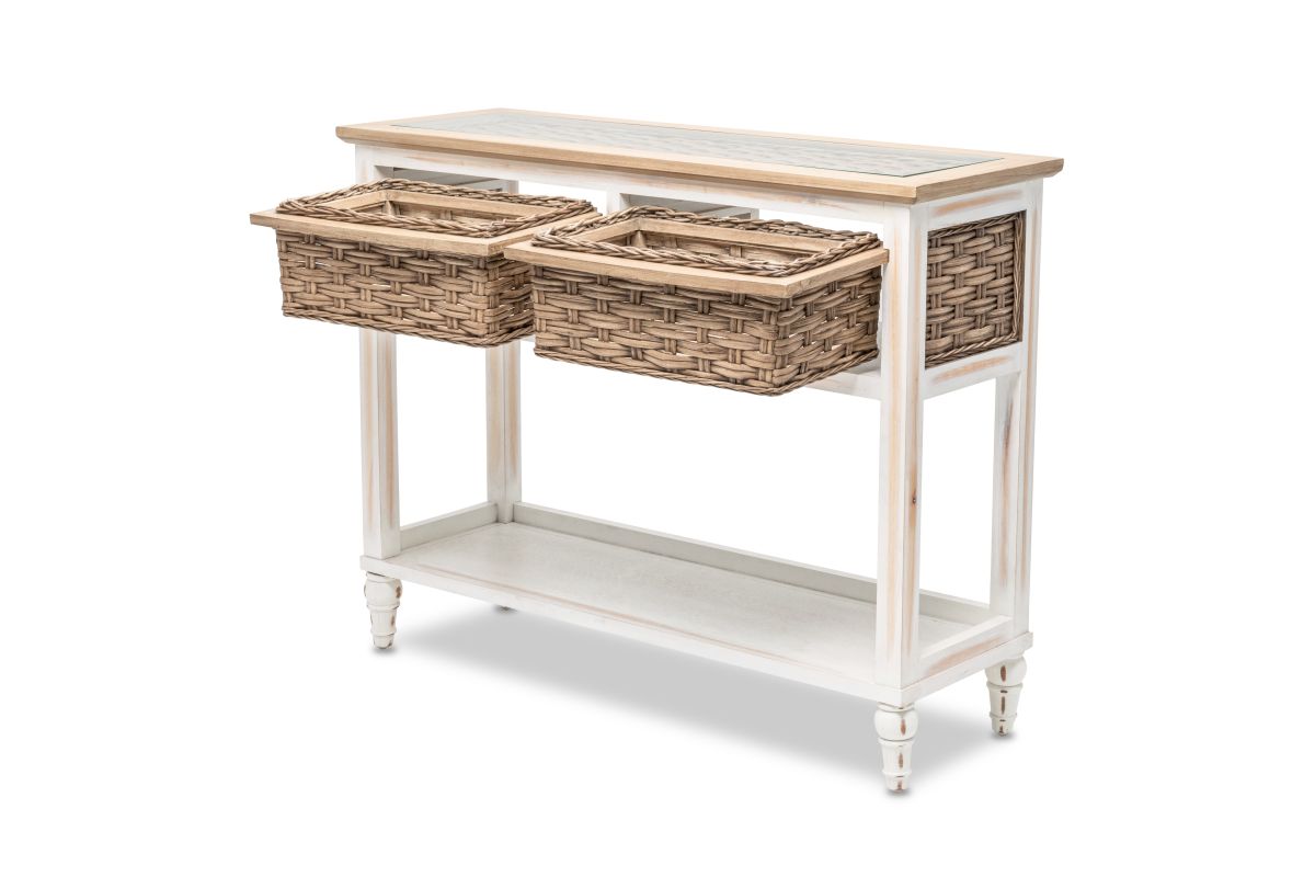 Store your everyday items with flair in the Island Breeze 2-Basket Console Table; its slightly distressed white & brown finish, wood and seagrass construction, and inset glass make it the perfect furniture accent. Enjoy effortless storage with the baskets that run on wood and easily assemble the feet in less than a minute with no tools. Keep it elegant and organized!