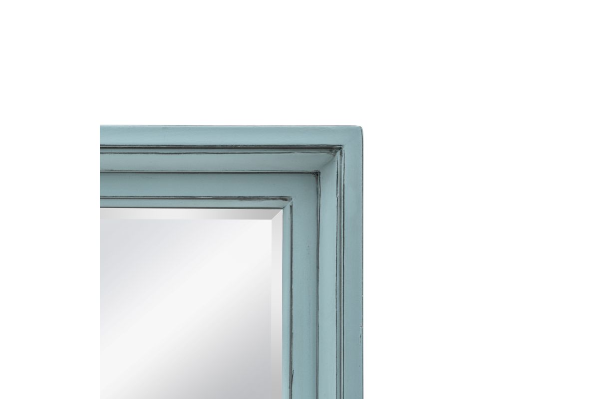 Discover creative style and superior quality with the Monaco Mirror. Crafted with Mindi Wood, this mirror's distressed white or blue exterior and light glazed edges add character to any setting. Plus, its silver or blue coating offers an enhanced image for your bedroom, bathroom, or living room. This wall-hanging mirror is easy to mount with its pre-installed slots - hardware not included.