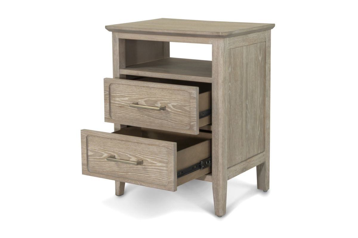 Complete your bedroom suite with this solid white oak nightstand, crafted with the same attention to detail and premium materials as the coordinating bed. Featuring a rich glazed driftwood finish, this nightstand adds warmth and sophistication to your space. Thoughtfully designed with both beauty and utility in mind, it includes full-extension ball-bearing drawer glides for effortless access and a convenient USB charging port discreetly located on the back.
